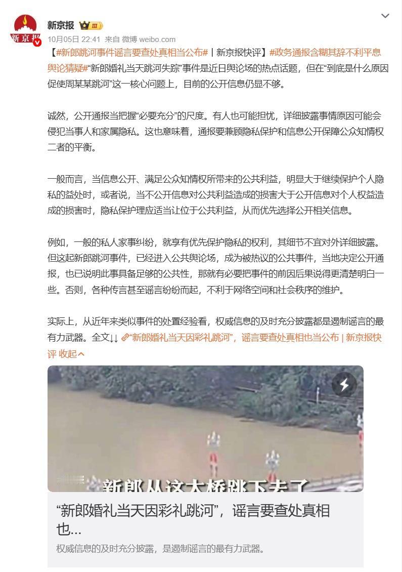 主要吧,一句“琐事”就跳河,说实话和大家的基本共识是有违背的。 这天然的怀疑就放大了谣言生存的空间,我觉得新京报说得挺有道理的,既然已经成为热点公共议题了,就应该在保护隐私的基础上适当公开和解释事情具体情况。