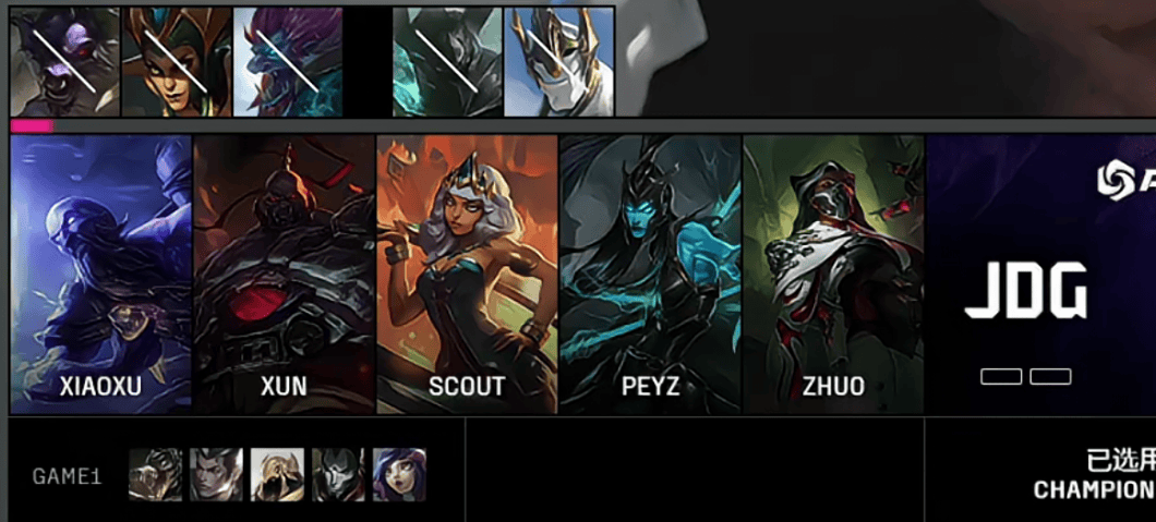 JDG选用:Xiaoxu赛恩、Xun琪亚娜、Scout瑞兹、Peyz滑板鞋、Zhuo烈娜塔