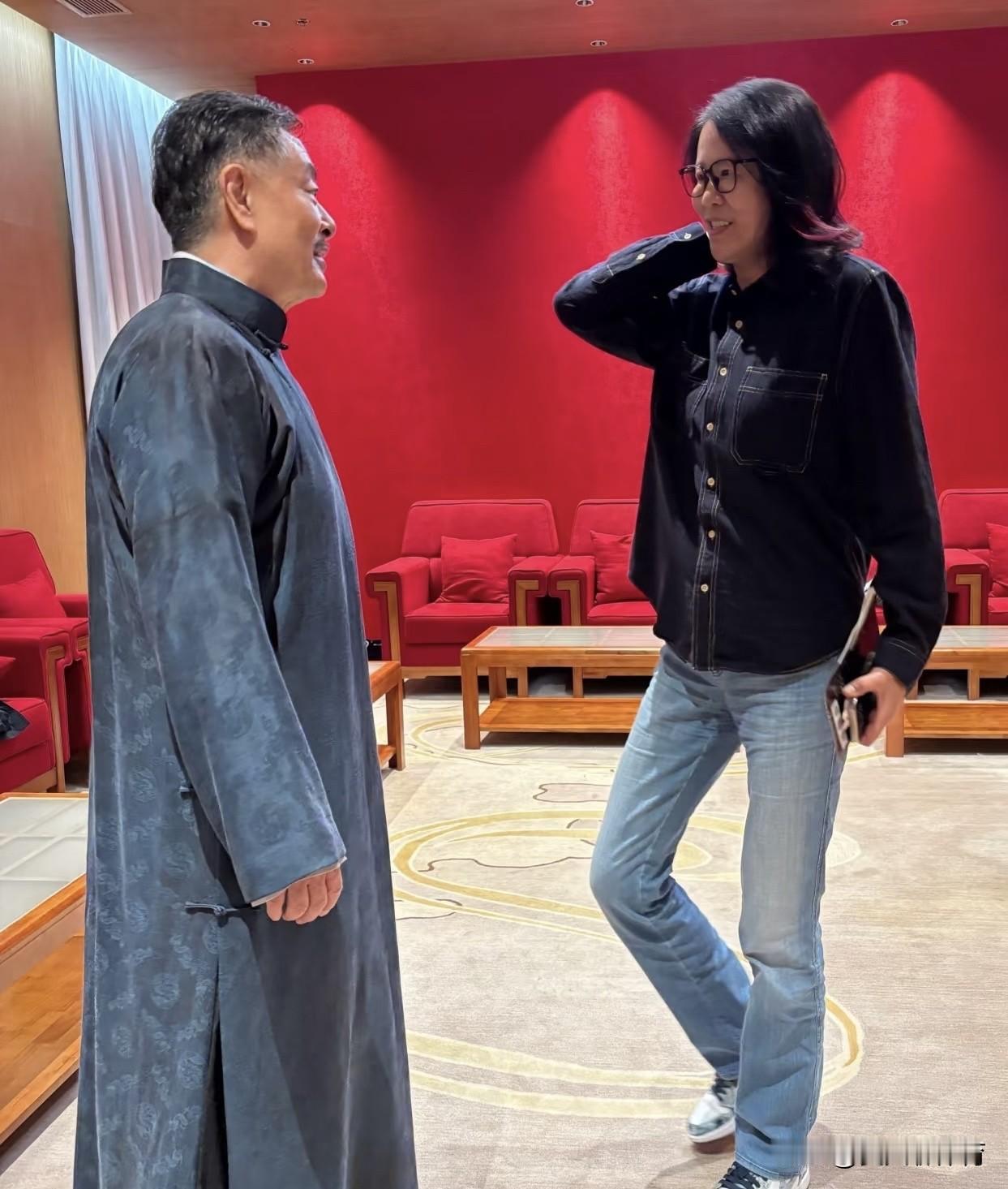 青春洋溢的郎平教练!今天正好是中秋佳节,郎平教练受邀冯远征导演的邀请,带着丈夫王育成一块走进人民话剧院,观看了话剧《雷雨》!第一张图片郎导身穿黑色衬衫、蓝色牛仔裤,耐克的板鞋,跟演员濮存昕热聊这张照片,特别像大学生,又飒又帅!演出结束后,郎平和冯远征导演,濮存昕在后台热聊!