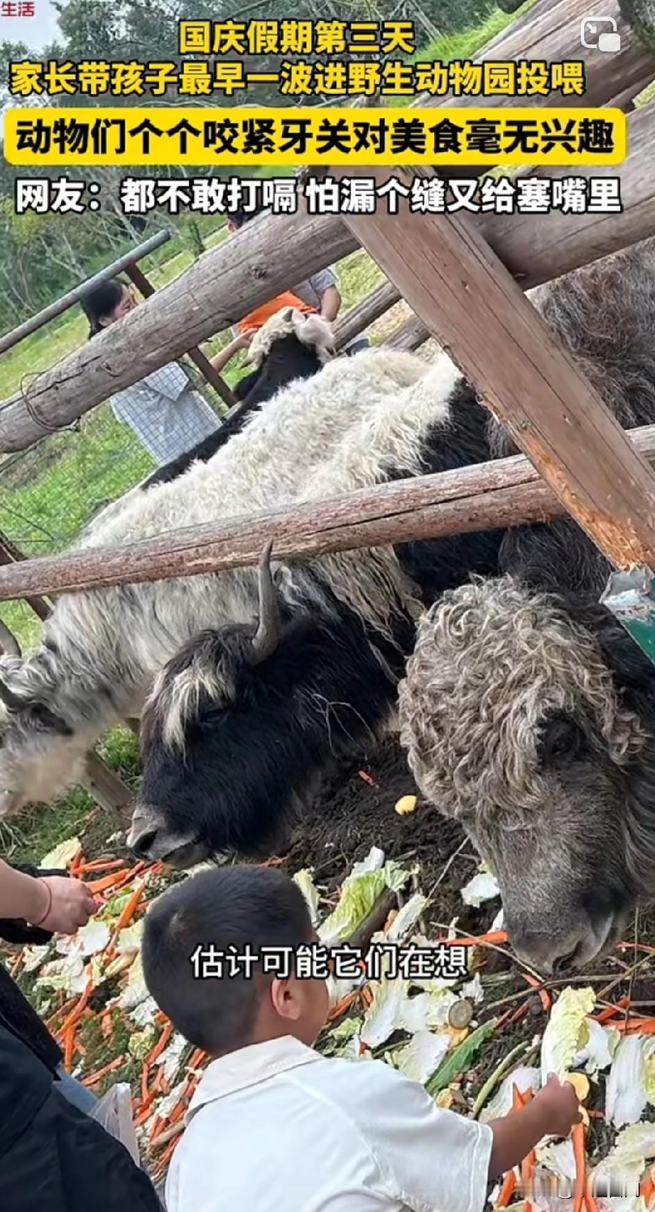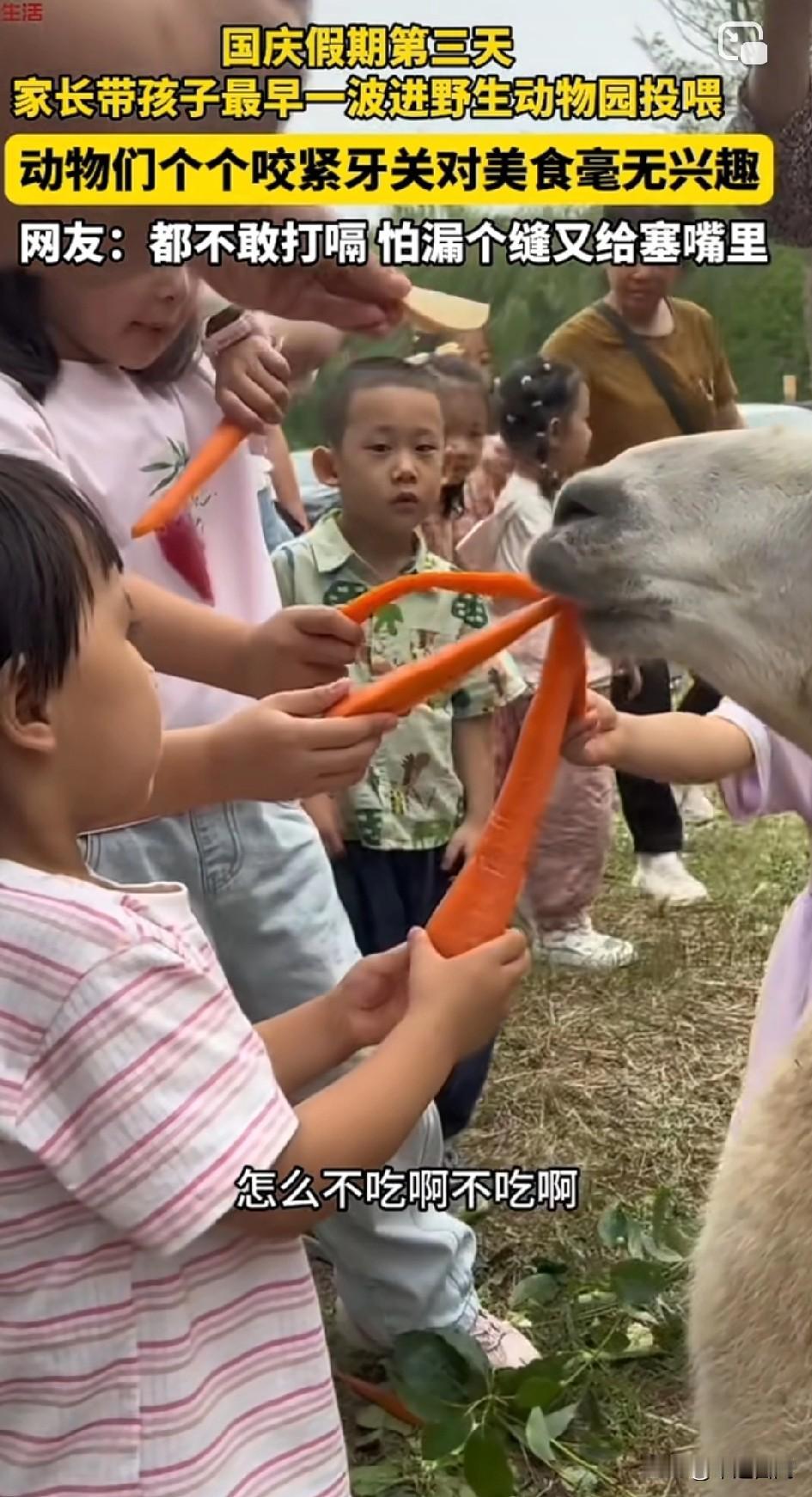 动物们被喂撑了![捂脸] 江苏南通。国庆假期第三天,家长带孩子最早一波进野生动物园投喂,动物们个个咬紧牙关对美食毫无兴趣。 孩子看到骆驼闭口不吃最爱的胡萝卜,好奇道:“妈妈,它是怎么了?” 骆驼:“你从早上吃到晚上,再从早上吃到晚上,试试,你还一次性多人投喂,我一口真的吃撑了,真的饱饱的,不要再喂了!”