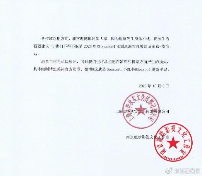 公告显示,鹿晗先生身体不适,在医生的强烈建议下,不得不取消2025鹿晗 Season4亚洲巡演吉隆坡站及东京-横滨站。退票工作将尽快展开,也将承担在酒店和机票方面产生的损失。