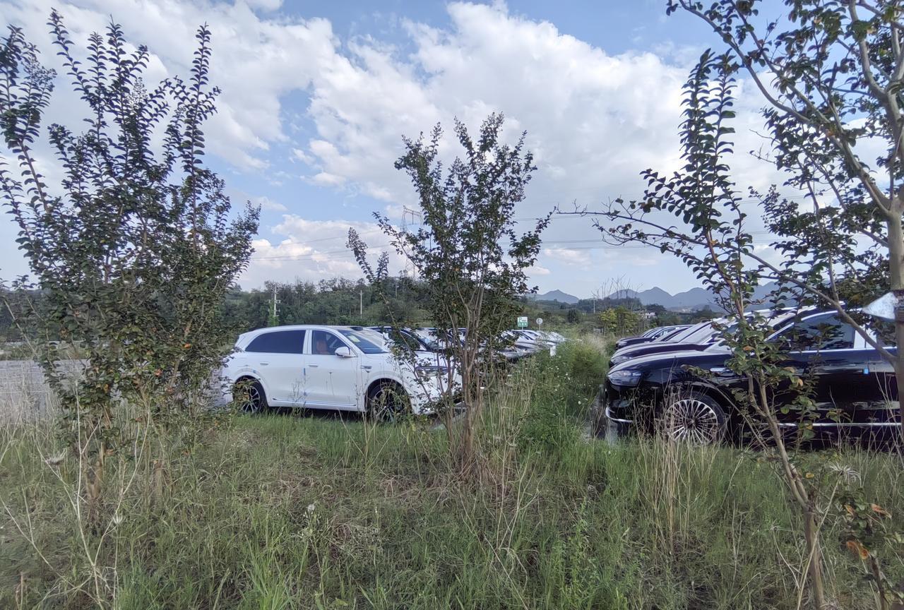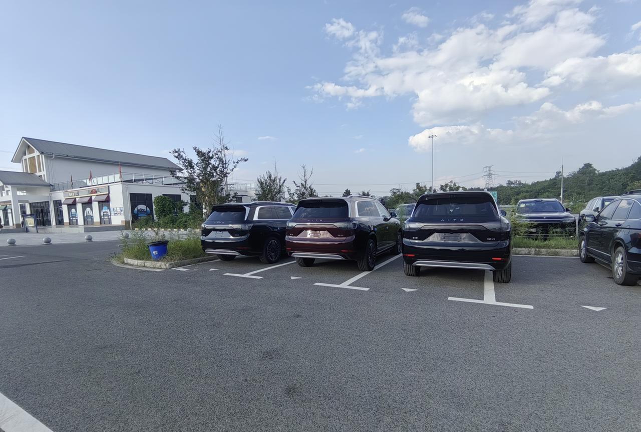 重庆三环高速石船服务区,停车场停了几十辆崭新的问界M7和M9,还有几辆装了新车的