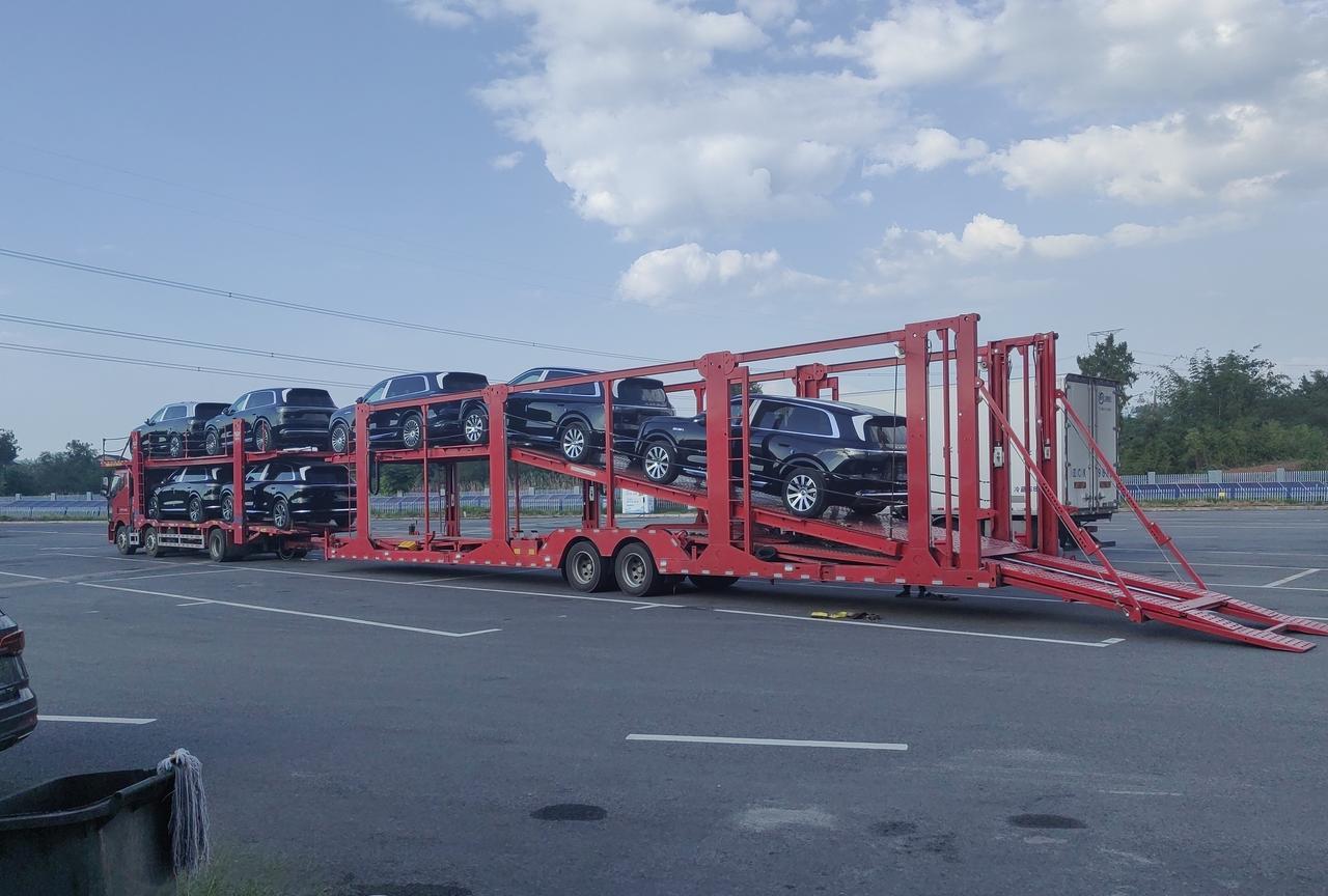重庆三环高速石船服务区,停车场停了几十辆崭新的问界M7和M9,还有几辆装了新车的挂车。 谁的新车等待交付了?