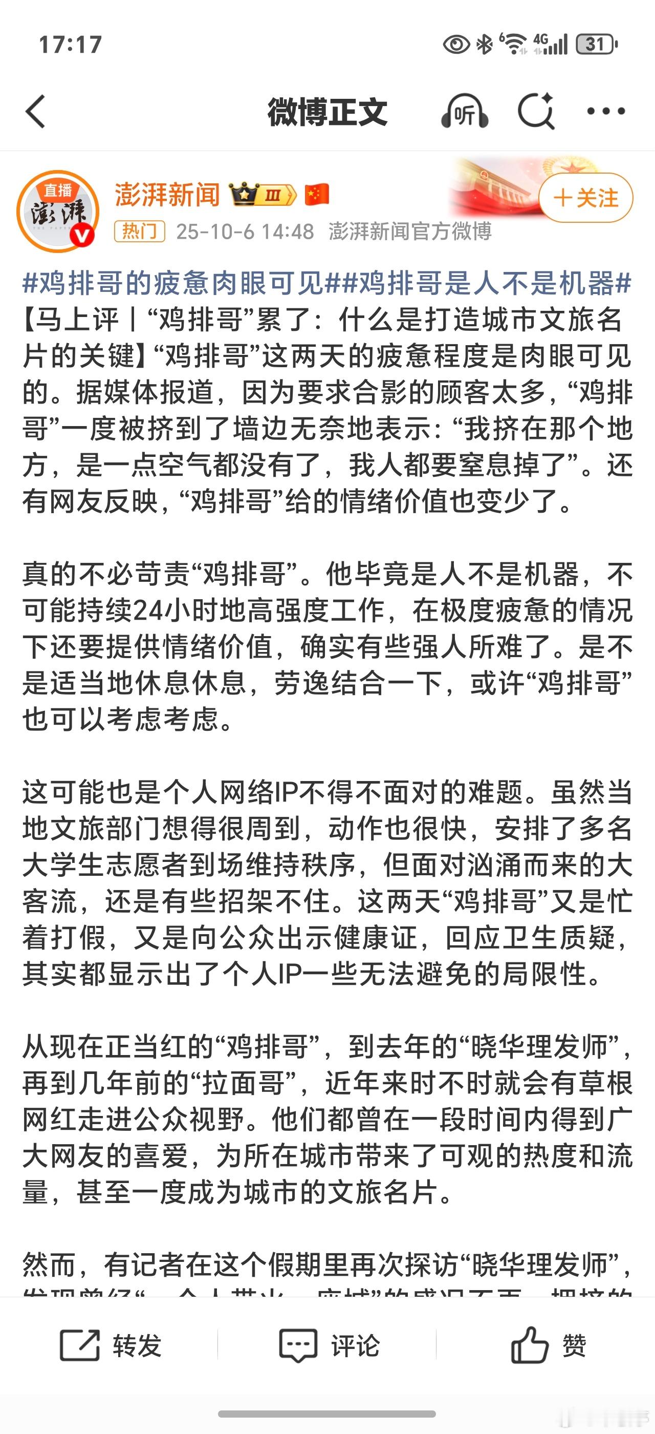 鸡排哥的疲惫肉眼可见草根网红的真诚可短期引爆流量,但疲惫、质疑与日久天长的审美疲劳终将消解新鲜感。城市名片确实需要从"造星"转向制度性服务与特色沉淀——让真诚延续在系统里,而非压垮个体肩上,这样才能持久。 ​​​