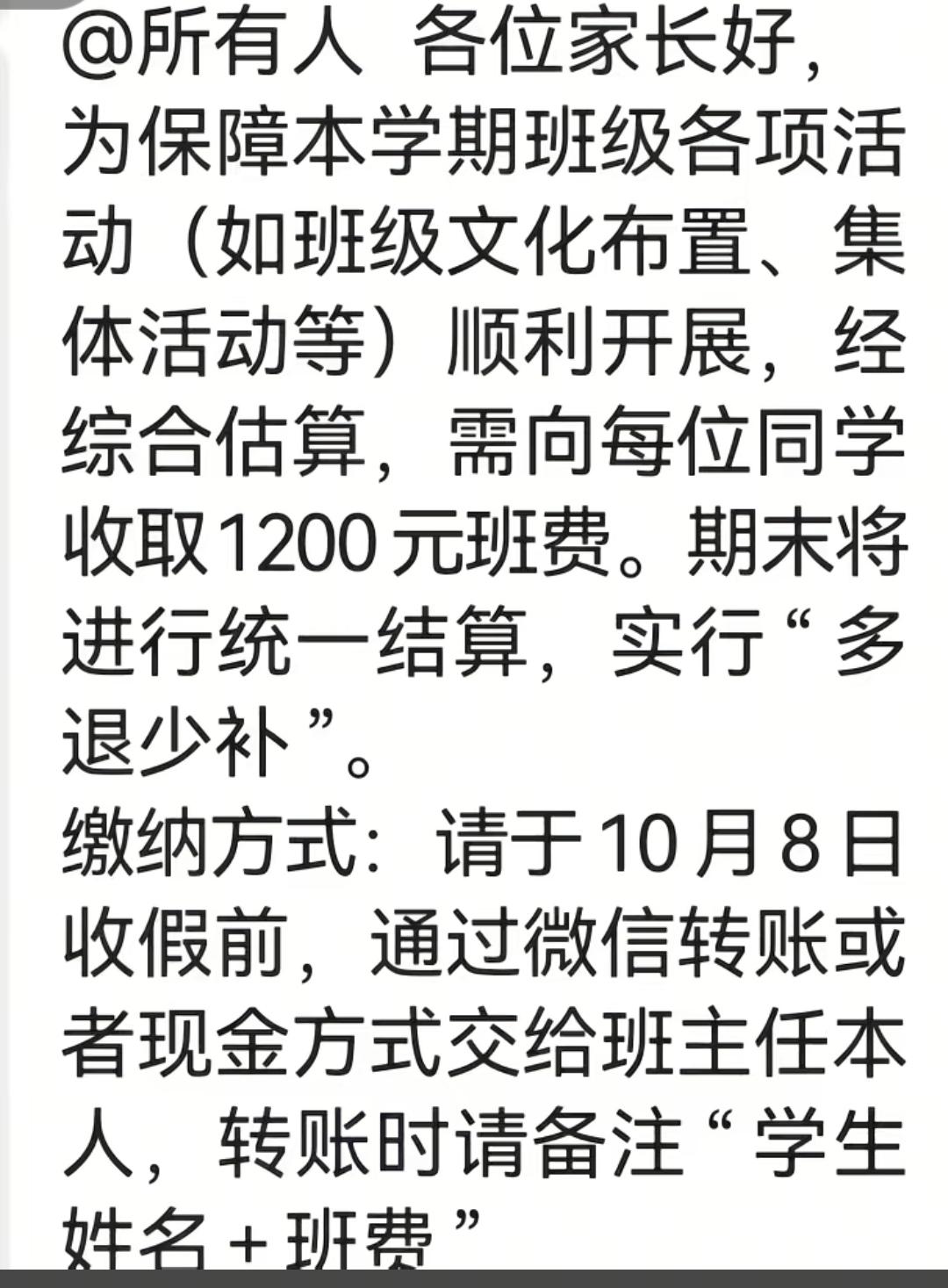 1200元的班费是否合理 近日有家长在网上曝光学校,说自己孩子的班主任老师在群里面说要收取1200元的班费。有家长在群里面问老师,这个班费1200元教育局是否知情。班主任以这个费用是用来保障班级文化建设、集体活动顺利开展来进行评估的后费用。要求每位同学在10月8日收假前通过微信转账或现金的方式交给班主任本人。 当家长提出质疑时,老师仅回复是班费来进行回应。此举肯定是不合理,班级收取费用肯定要有相关的细节公示,不然家长不可能稀里糊涂的就缴费。再说这个每人交1200元的班费,老师有没有想过这个班费是不是太多了一些。根据教育明确规定,班费的收取虽然是采取“自愿”的原则,但应该是要公开、透明,且需要提前进行公示预算,起码要让家长看到费用的去向以及合理。此次收费明显未与家长进行沟通,也并未明确后续细节公示机制,那这个收费程序显然是不合规。 现在家长对学校收费的事情本来就比较敏感,这种先收费后解释的模式容易引发信任危机。若这件事引发的舆论导向比较严重,那教育行政主管部门肯定是要介入调查,学校应及时进行调整。如可以公开班费的用途、核查班费的收取是否是家长自愿、对涉事班级的财务进行管理。 你们觉得班费1200元是否合理? 初中班费 秋季学期的收费 班主任乱收钱 课外班费用 代班费 烫手班费 班会费 收班费话术 班费退费 班费自捐 班费报销 大学天价班费 对象班费 重点班价格表 语言班费用