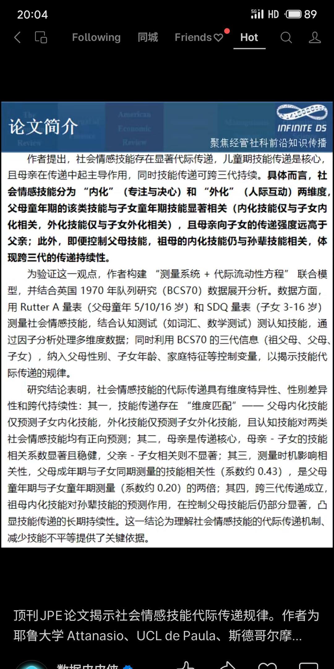 一项发表于《Journal of Public Economics》的研究表明,社会情感技能在代际间存在明显传递。母亲的作用显著强于父亲,且童年期技能比成年期更能反映真实传递。此外,祖母的内化技能对孙辈仍有影响,显示出跨代持续性。