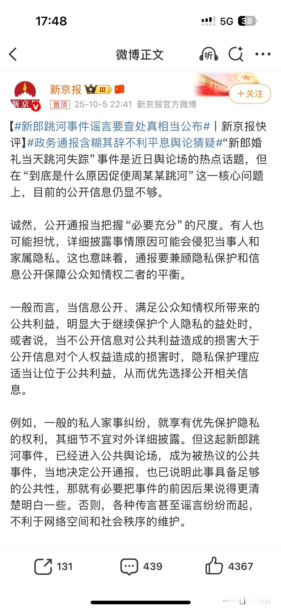 新京报:“新郎婚礼当天跳河失踪”事件是近日舆论场的热点话题,但在“到底是什么原因促使周某某跳河”这一核心问题上,目前的公开信息仍显不够。