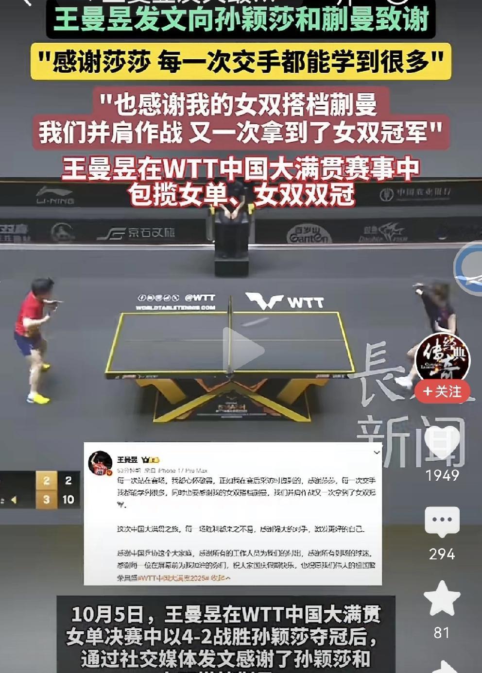 这就是曼昱的高情商[赞] 曼昱,成为WTT中国大满贯的双冠王 发文感谢莎莎和蒯曼: “感谢莎莎,每一次交手都能学到很多!” “也感谢我的女双搭档蒯曼,我们并肩作战,又一次拿到了女双冠军!” 曼昱夺冠,和她自己多年如一日的努力有关。 可是,她却没有居功自傲,而是把对手搭档放在前面,抬得很高! 想起伊藤美诚妈妈说曼昱的一句话: 王曼昱的球技和人品,都是很好的! 王曼昱挑战赛 国乒美女曼昱