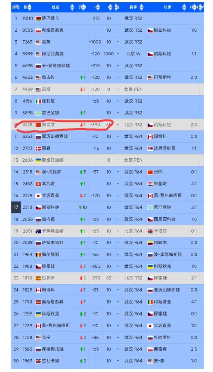 郑钦文如果本赛季接下去的所有比赛都不参加,她还有多少分要扣,她的世界排名会跌到多少名? 武网不参加,扣650分,东京站不参加,扣500分,总决赛没资格参加,扣800分。三项加起来要扣1950分,这样郑钦文的分数只有1728分了。而现世界排名第30位的拉杜卡努是1563分,郑钦文明年年初的世界排名大概率也就在32名左右了。就像此前的王欣瑜一样,整天纠结能不能进前32,需不需要打第一轮的比赛。 看看后续郑钦文会不会先参加几站低级别的赛事,给自己练练手,也增加一点自信心!