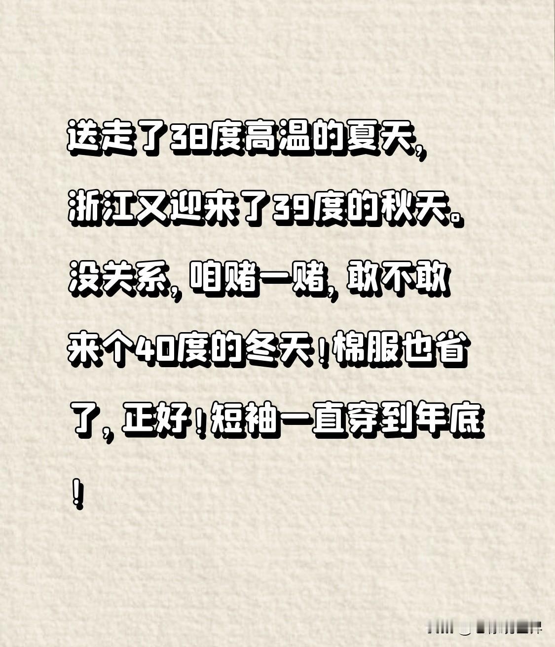 送走了38度高温的夏天,浙江又迎来了39度的秋天。 没关系,咱赌一赌,敢不敢来个40度的冬天! 棉服也省了,正好!短袖一直穿到年底! 浙江气温 浙江热浪 浙江八月温度 浙江温度飙升 浙江秋假 浙江43高温 浙江度假