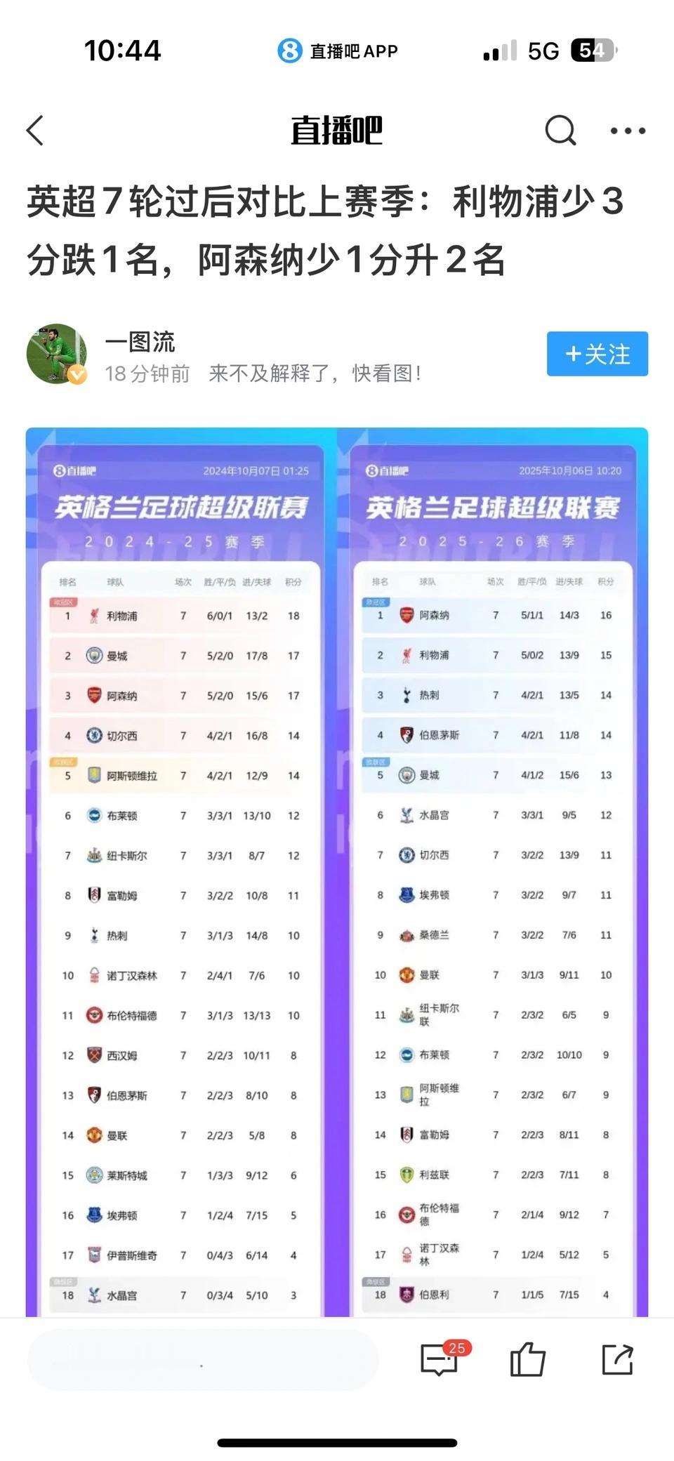 目前英超积分榜,跟上赛季同期有啥区别。 去年利物浦18分,今年15分。 去年阿森纳17分,今年16分。 去年曼城17分,今年13分。 去年切尔西14分,今年11分。 去年曼联8分,今年10分。 去年热刺10分,今年14分。 如果我没有看错,曼联和热刺,两个联盟杯决赛球队,还比上赛季进步了!! 尤其阿莫林表现比滕哈赫好?我都忘记去年滕哈赫的糟糕了,阿莫林冤枉了??[笑哭]