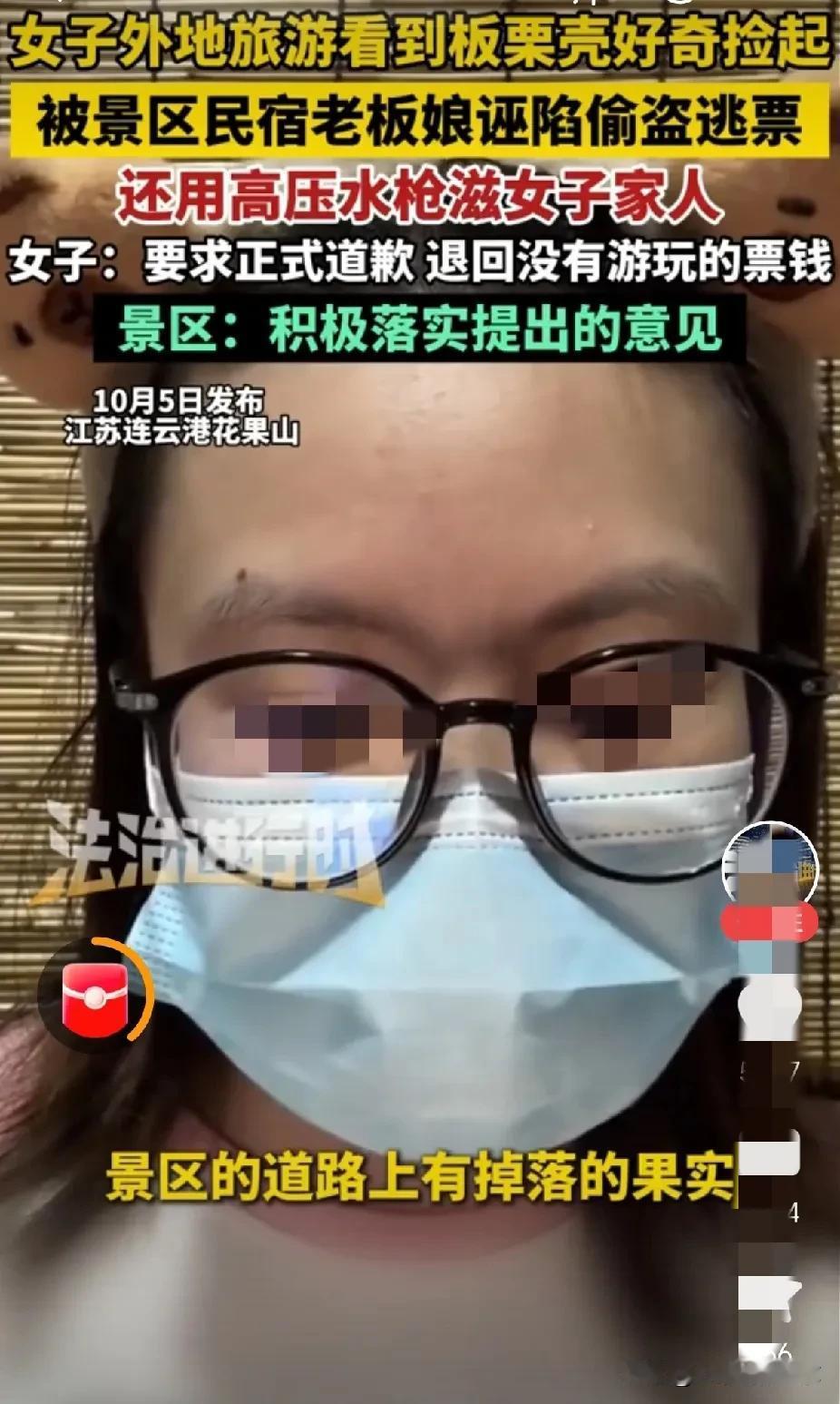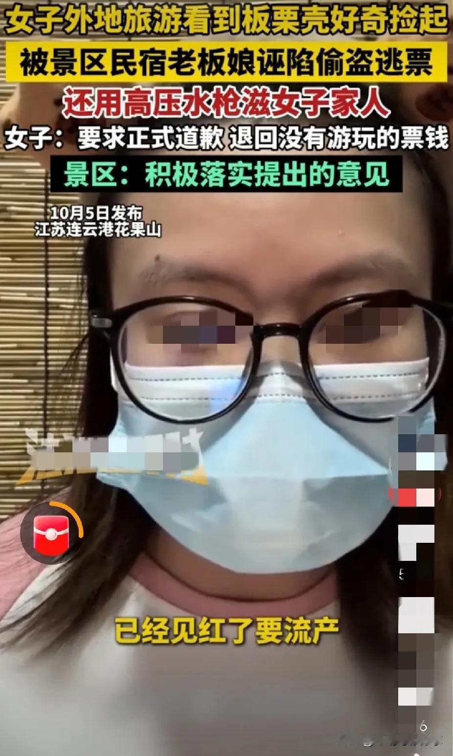 现在全网最后悔的, 应该是连云港花果山那位民宿老板娘了吧! 连云港文旅局好好策划的一场盛宴,被她破坏了不说,自己还“社会性死亡”了一次! 2025年10月2日,一名游客在江苏连云港花果山景区路边捡拾板栗壳,被民宿老板娘诬陷。 据说,游客还赔偿了300块钱,这场闹剧才算暂时结束! 而游客越想越气,明明是一个板栗壳,自己受欺负就算了,连自己的妈妈和外婆也受到了欺负,这事必须给个说法! 所以,10月5日,她把自己的经历发到了网上,让广大网友给她评评理,钱不钱的无所谓,就是想要一个道歉! 网友们也没闲着,真的把此事顶上了热搜。现在涉事民宿老板娘也说要追究游客的法律责任了,只能说这又是一步我们看不懂的棋啊! 镜头给到了连云港文旅局,也不知道他们会如何处理此事呢?