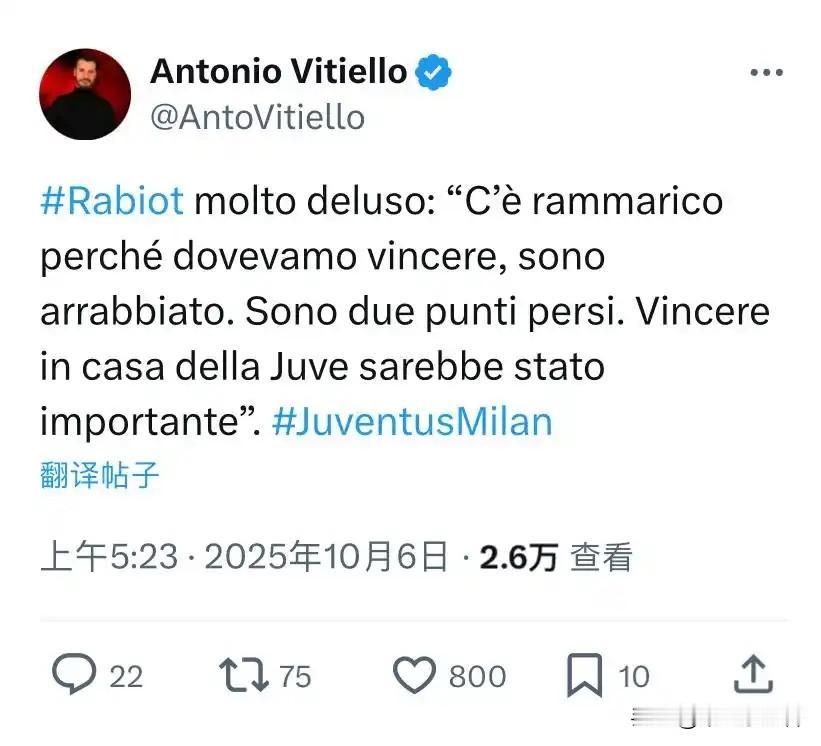 拉比奥特赛前接受采访表示米兰与尤文图斯之战就是一场普通的比赛,但赛后拉比奥特说出了心中所想,拉比奥特赛后接受采访表示我非常失望,之所以失望,是因为我们本应该赢球,我很生气。我们丢掉了两分。在尤文图斯主场赢球很重要。 我相信赛前拉比奥特肯定是想证明自己,尤文图斯当年没有续约,然后工资只有三分之一出走法甲我不相信小英雄拉比奥特没想法,而且本场比赛貌似一直都被嘘,哪怕赛前真的没那么多想法,比赛开始后肯定是想拿下比赛。拉比奥特也没办法,左路的巴特萨吉防守孔塞桑太吃力,拉比奥特不得不帮忙,这也是这场进攻难看的一个原因,拉比奥特不敢投入到进攻,个人觉得小英雄拉比奥特是想有所作为的,我相信拉比奥特真的进球了,他能来一个阿德巴约式的庆祝。 赛后接受采访表示不满,拉比奥特内心肯定是有点委屈,全场兢兢业业投入防守,放弃进攻数据,可惜前面的人不给力,生气也是正常的,小英雄拉比奥特没展现英雄一面就不错了。只是个人想法,莫德里奇与拉比奥特对于莱奥的表现很可能是不满意的,莱奥很多球拉比奥特已经看出来不满了。