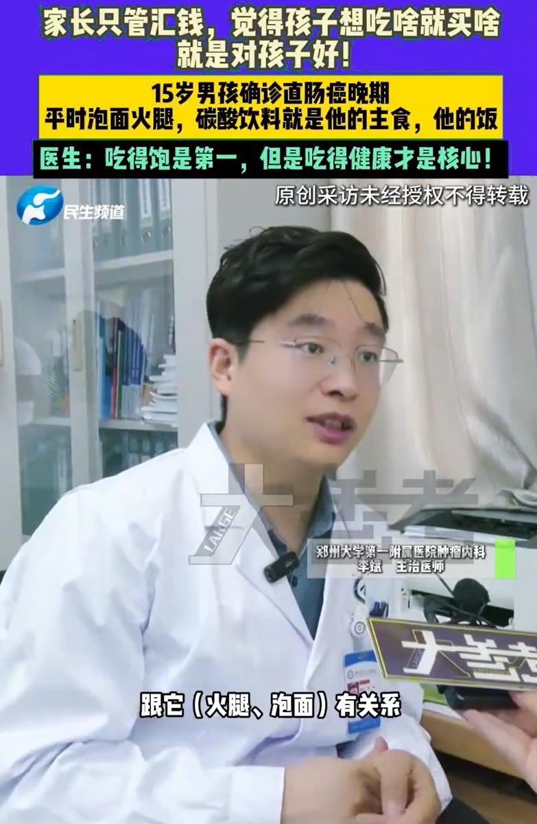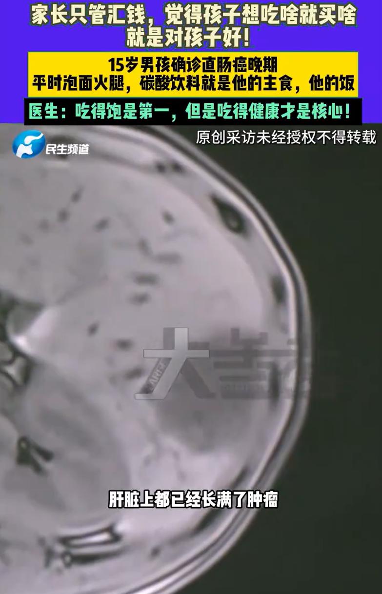 河南郑州,一对父母常年在外地打工,觉得对孩子有亏欠,就给他打钱,让他喜欢吃什么就买什么,没想到,15岁的孩子去医院检查,确诊了直肠癌晚期。医生:吃得健康才是核心! 医生在做CT时发现,孩子的肝脏已经布满肿瘤。这么小的年纪,按理说非常罕见。可仔细一问才知道,这孩子每天的饮食,几乎就是泡面、火腿肠、奶茶和碳酸饮料的循环 医生说,病情和这些饮食习惯有直接关系 父母在外辛苦挣钱,总以为让孩子“吃得饱”“随便买”就是对他好。可他们没意识到,真正的好,不是他想吃什么就吃什么,而是他该吃什么才吃什么。吃饱重要,吃得健康更重要 说实话,看到这样的事挺让人心痛的,父母忙着挣钱,以为让孩子吃得饱、穿得暖,就算尽责。可孩子在成长阶段最需要的,是有人告诉他什么能吃、什么该少吃,什么事能放纵,什么该自控。健康从来不是靠钱堆出来的,尤其对正在发育的孩子来说,一瓶奶茶、一个方便面,看似小事,日积月累就会变成隐患 我们总说“再苦不能苦孩子”,但很多人误解了这句话——它不是指在花钱上不限制,而是在身心照顾上不马虎。哪怕不在身边,一个电话、一次视频,多问问孩子吃了什么、提醒他少吃零食,也是一种责任