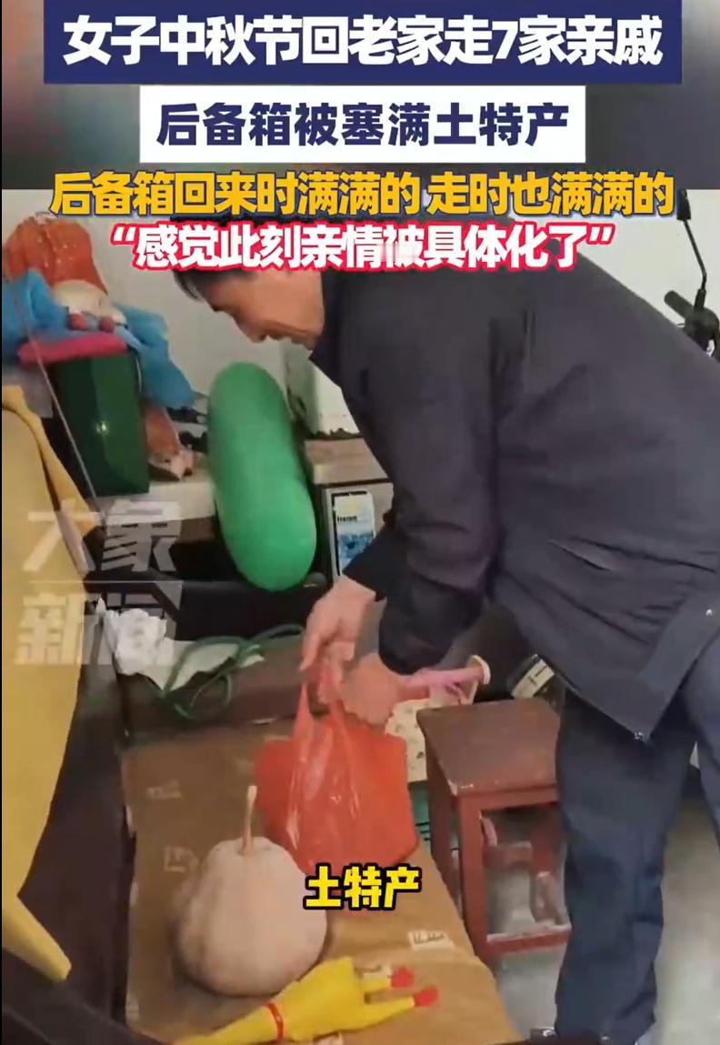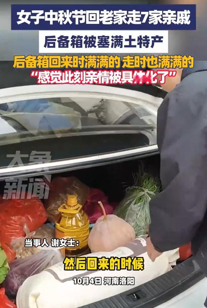 “这就是农村人的实在!”河南洛阳,女子回老家过节,中秋节期间连走了七家亲戚,结果去的时候后备箱还是空的,临走时后备箱被塞满了土特产,女子也是瞬间感叹:感觉此刻亲情被具象化了 谢女士介绍,自己平时工作比较忙,所以回老家的机会不多,刚好这次假期回来,就想着到亲戚家串个门,两天时间里走了7家亲戚,本来打算轻装上阵,结果离开时后备箱被塞得严严实实,连个缝都不剩 其实亲戚们给的都不是什么贵重东西,自家地里刚摘的黄瓜西红柿,刚腌好的腊肉、家里现蒸的馒头,样样都是亲人们自己动手做的东西 对他们来说,这不是送礼,而是把自家最好的拿出来让你带走。那一袋豆角、一块腊肉 她说那一刻看着满满当当的后备箱,突然有点想哭。不是因为拿了多少,而是那种被惦记的感觉。离家久了的人都懂,这种实在的关心,比什么问候都更有分量。老人嘴上不说“想你”,但一定会在你临走时拿着塑料袋、纸箱往车里塞,边塞边说“这都是自家弄的,拿着不占地方” 其实很多人回老家都会经历类似的场景:一开始说不用不用,到最后还是没拗得过那份热情。农村的亲情就是这样,简单直接,不讲客套,不讲形式。用最朴实的方式让你带着家的味道离开
