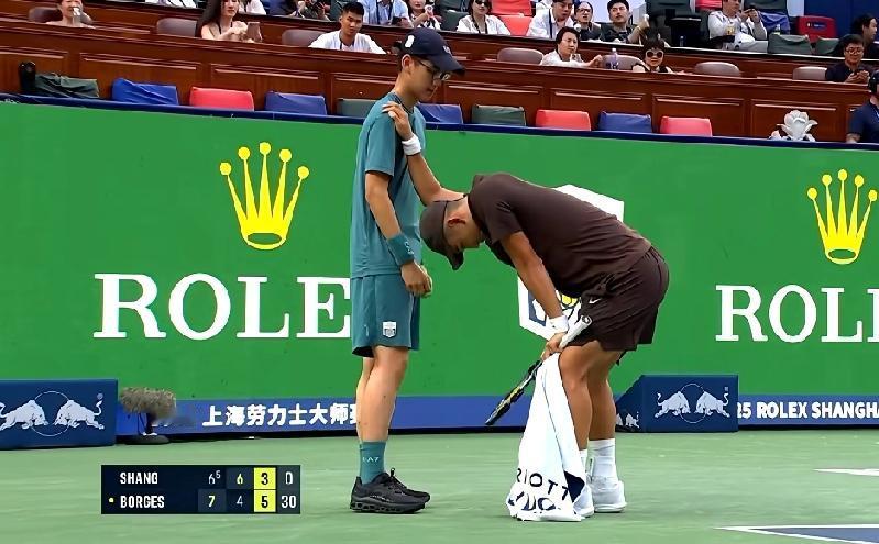 这是商郡程今天最后几分时候的画面,打一球之后都要扶着边上的球童肩膀休息一会…… 其实今天商郡程在第二盘就已经出现体力严重透支的情况了,我都以为他这次又要伤退了,没想到今天他却打满了三盘。可惜的是,最后以一个发球局的劣势输掉了比赛,如果第一盘的抢七能争气一点,就比如那个先放小球,再挑后场高球的那个球能拦截到,可能就赢下比赛了。 商郡程球商高,变线能力强,还是败在体能和身体素质上,这两个提高,前15完全可以。可这两项,基本都是从娘肚子里面带出来就有的,要想得到提升,真的要付出比其他运动员多出几倍的努力,也不一定能办到!