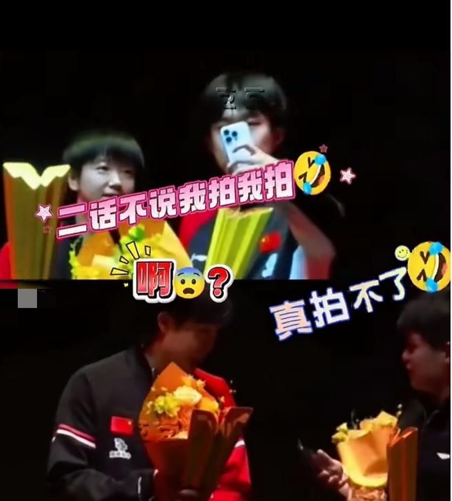 混双冠军自拍,王楚钦主动拿过手机拍照。 男双冠军自拍,王楚钦示意林诗栋拍照。 林
