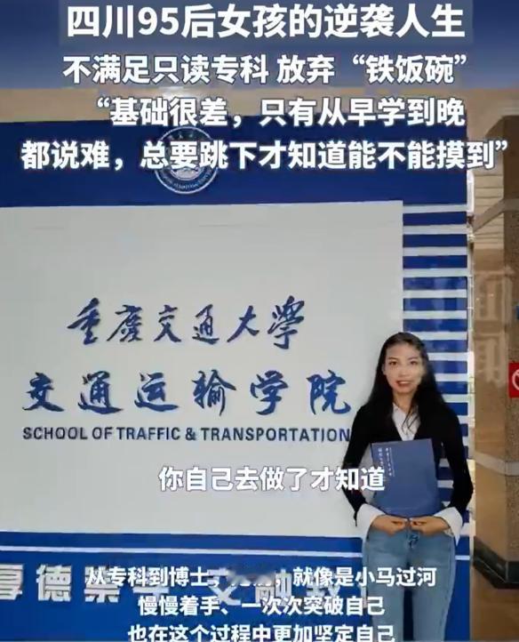 四川自贡,一名95后女孩高考发挥失常,考进了一个大专,本来毕业后就能有一个“铁饭碗”进成都地铁工作,可她却放弃了,用8年的时间从专科考到了博士,值还是不值。 麻烦各位读者点一下右上角的“关注”,留下您的精彩评论与大家一同探讨,感谢您的强烈支持! 刚入大专时,张宇航所在的专业与成都地铁有定向合作,同班同学大多憧憬着毕业后稳定的工作,早早规划起职场生活。 当身边人开始讨论实习安排、晒出未来工作场景时,张宇航却在心里埋下了 “不甘心” 的种子:她不想刚成年就被固定的人生轨迹束缚,更渴望去探索更多可能性。 于是,在大家为 “铁饭碗” 努力时,她悄悄制定了 “专升本” 计划,把课余时间都泡在图书馆,背单词、啃专业书,成了校园里最 “不合群” 的人。 这段起步之路并不顺利。第一次参加 “专升本” 考试,她虽过国家线却在复试中失利。 那晚,她给父亲打电话崩溃大哭,父亲的沉默与最终那句 “再试一年,爸爸支持你”,给了她坚持下去的勇气。看着同班同学陆续入职地铁、晒出工资条和年终奖,她也曾动摇:是不是自己太固执? 然而每当想起划掉定向就业协议时的坚定,想起对更广阔世界的向往,她又重新拿起书本。终于,第二次考试,她成功考入重庆交通大学,拿到了本科录取通知书。 进入本科阶段,张宇航没有放松。她不仅保持优异的成绩,还主动申请加入导师的科研项目,从帮导师整理数据开始,慢慢接触学术研究。 后来她成功考上重庆交通大学交通运输工程专业硕士。读研期间,她不再是只会做题的学生。 而是真正爱上了学术:参与的智能交通信号优化项目获全国交通科技大赛二等奖,在学术会议上展示成果时的兴奋,让她第一次真切感受到 “做喜欢的事” 的快乐。 最终,她成功成为重庆交通大学博士研究生,8 年的坚持,终于有了圆满的结果。 有人说她 “浪费时间”:8 年里,同龄人已攒下存款、积累职场经验,她却才刚起步;也有人担心她的专科起点会成为职场 “隐形天花板”。 其实,张宇航的故事最动人的,不是从专科到博士的逆袭,而是她敢于打破世俗期待、坚持自我选择的勇气。 人生不是一场与他人的赛跑,而是与自己的对话:无论是选择安稳的工作,还是追求未知的梦想,只要是遵从内心的选择,并愿意为之付出努力,就是最 “值” 的人生。 那么你们怎么看待这件事呢?欢迎在评论区说说你们的看法吧! 信息来源 :全羊网 2025-09-20