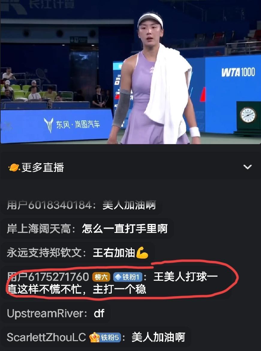王欣瑜比赛的直播间,球迷这样评价她:王美人打球一直这样不慌不忙,主打一个稳字。 这段话是在夸王欣瑜吗?我咋感觉是在调侃她啊? 今晚王欣瑜状态不是很好,抬手就是ue,好在对手内岛萌夏实力不怎么样,状态也是一般,总算没有让比分拉的很开。 今晚王欣瑜还难得的局休期间翻看小本本,显然对内岛萌夏这个对手是有所准备的,就是场上的执行力不够,失误太多。