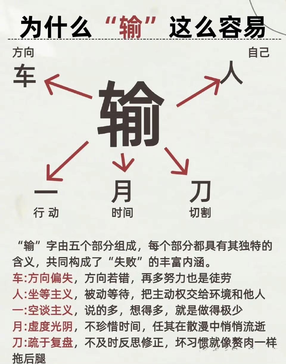 没想到一个“输”字,竟藏着人生成败的底层门道 你可曾仔细端详过“输”字?看似简单的结构,拆开了竟藏着成败的底层逻辑,每一笔都像一把标尺,丈量着人在逐梦路上的得失。 “车”如方向,若行差踏错,再多努力都是南辕北辙。就像民国时有人投身没落的旧行当,任凭如何挣扎,也逃不过被时代淘汰的命运。 “人”若失了主动,沦为坐等主义,便把胜负的钥匙交给了旁人。晚清那些固守祖制、坐等变革的官僚,最终只能在历史的浪潮里节节败退。 “一”是行动的标尺,空谈者纵有千般谋划,没有落地的“一”,也只是镜花水月。古往今来,多少谋士空有奇策,却因缺乏执行力,让良计成了泡影。 “月”是光阴的刻度,虚度者任时间在指尖流逝,成功的契机也随之湮灭。就像《伤仲永》里的天才,在日复一日的懈怠中,把天赋消磨成了平庸。 “刀”是复盘的利刃,疏于反思者任由坏习惯盘踞,最终被自己的短板拖入败局。项羽若能在鸿门宴后复盘己过,或许楚汉相争的结局会截然不同。 原来,“输”从不是偶然降临,而是在方向、主动、行动、时间、复盘的维度上,一次次失当的累积。看懂了“输”字里的门道,便握住了破解失败、奔赴成功的密钥——校准方向、主动作为、知行合一、珍惜光阴、勤于复盘,方能在人生的棋局里,把“输”的风险碾碎,让“赢”的曙光渐明。