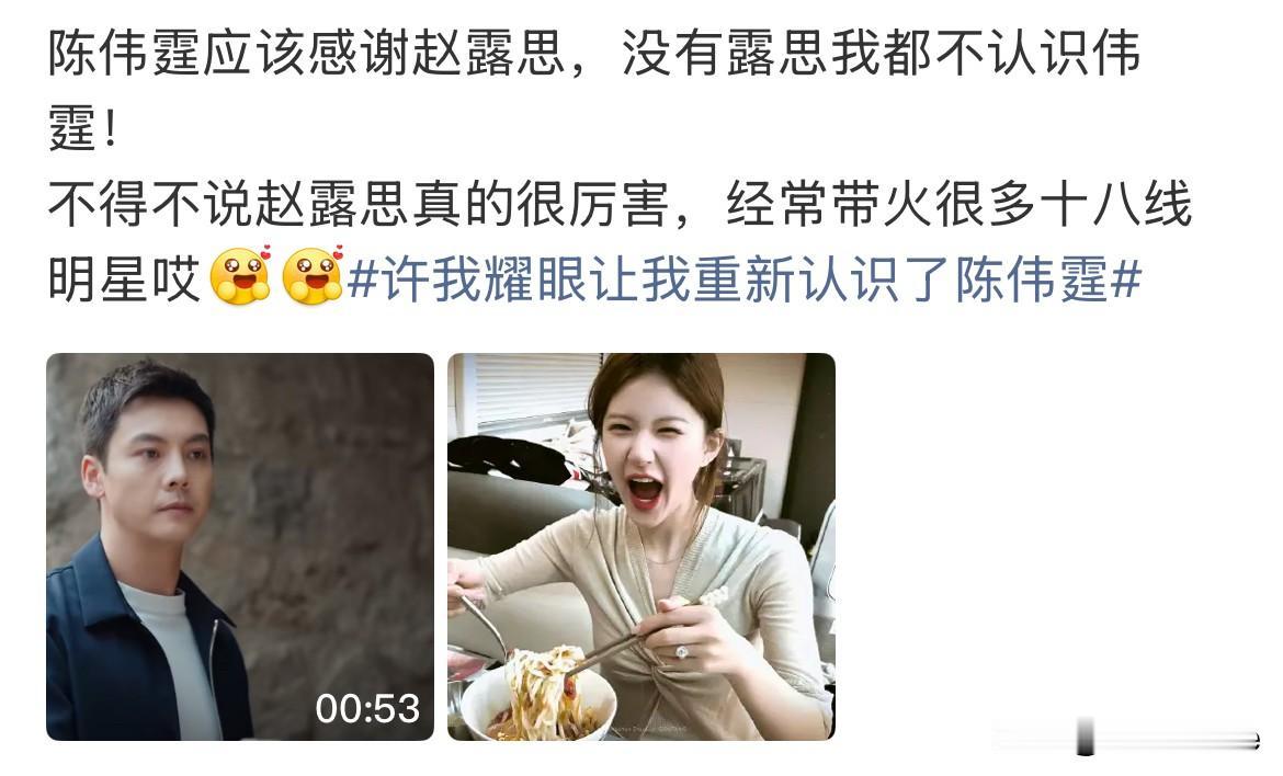 10月6日,有人说,陈伟霆应该感谢赵露思,《许我耀眼》让观众重新认识了陈伟霆,还