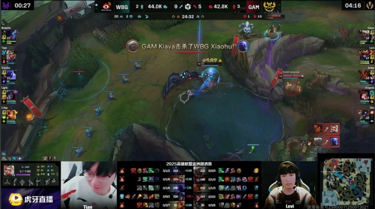 [25:53]WBG极速掏掉大龙,Levi龙女怒气不够没大,WBG中上推进,推掉GAM上路二塔,经济领先2k。