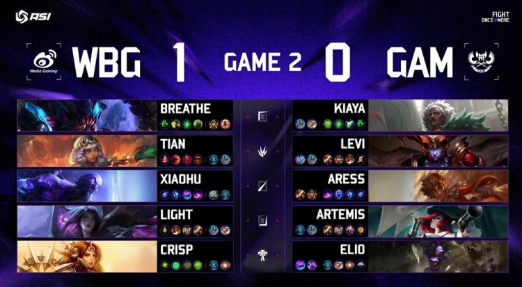 [20:02]GAM中路推进放出先锋拔掉WBG一塔,WBG吃掉厄塔汗,上路团战,Aress岩雀单杀小天奇亚娜,Kiaya安蓓萨逮捕xiaohu,GAM打出0换2,双方经济持平。