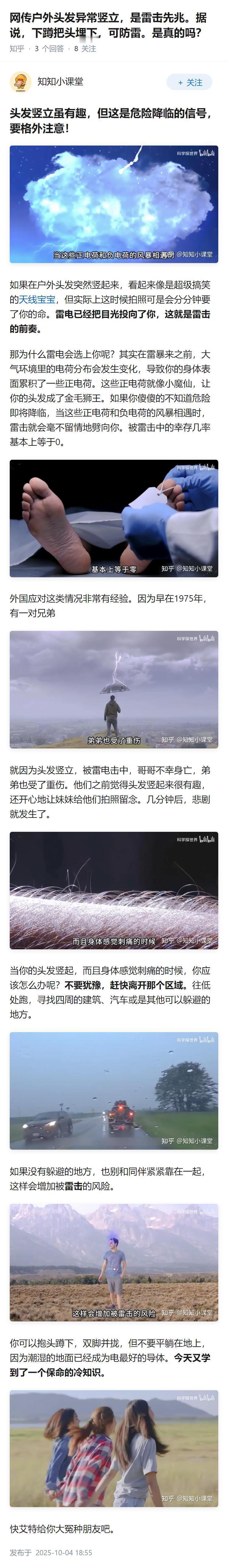 网传户外头发异常竖立,是雷击先兆。据说,下蹲把头埋下,可防雷。是真的吗?