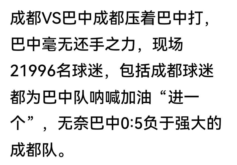哈哈,川超成都队“不得人心”,不仅20支队伍都喊“干成都”,连成都球迷也倒戈,在成巴之战中为对手喊“雄起!”[笑哭] 可抽到川东片的成都队已三战全胜,得失球比为15:1,实力是完全不在一个平台的碾压级。这比赛还有啥看头嘛,虽有2万多人踊进双体,但买票进场也是打瞌睡,只好给对手加油才刺激。 我估计,接下来这种模式将继续,当成都队以全胜战绩夺冠时,成都球迷才会整齐划一为本土队喊雄起。