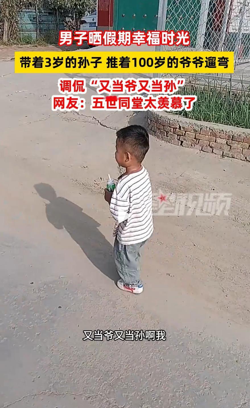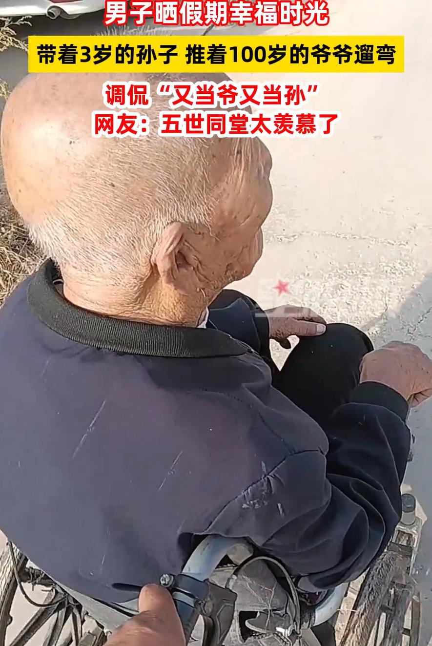 “好幸福啊!”河北,一男子假期带着3岁的孙子看望自己100岁的爷爷,嘴上调侃自己“又当爷爷又当孙子”,但幸福都要溢出屏幕了,网友:这是真正的五世同堂啊! 视频里,百岁老人安坐在轮椅上,面容平静。三岁的曾孙手握一瓶酸奶,在他面前蹦跳走动,偶尔吸一口奶。孩子还不懂得一百岁意味着什么,也不明白时光的重量。他只是享受着手中的酸奶和自由走动的乐趣 而站在两人中间的那位男子,看着这一老一少,轻声调侃自己:一个人照看两个人,又当爷爷又当孙子。这句话看似玩笑,却藏着深深的幸福 很多人可能不太能体会这种感觉。一个家庭能见到五代人同框,不只是长寿的幸运,更是一种时间的延续。爷爷经历过的时代,父辈奋斗的岁月,子辈承担的责任,都在这一瞬间汇聚在了一起。孩子还不懂什么是“五世同堂”,他只知道面前有个笑眯眯的太爷爷,还有个陪他跑前跑后的爷爷,家人的爱就在这种不言不语的相处中被传递下去 男人那句“又当爷又当孙”,其实特别有意味。对上,他是晚辈,依然要照顾、尊敬百岁的老人;对下,他又成了长辈,要带着孙子见证家族的延续 这种角色的交替,是一种人生厚度。很多人觉得“幸福”是房子、车子、存款,其实当你能陪着三代、四代、五代人坐在一张桌前吃饭时,那才是真正的圆满