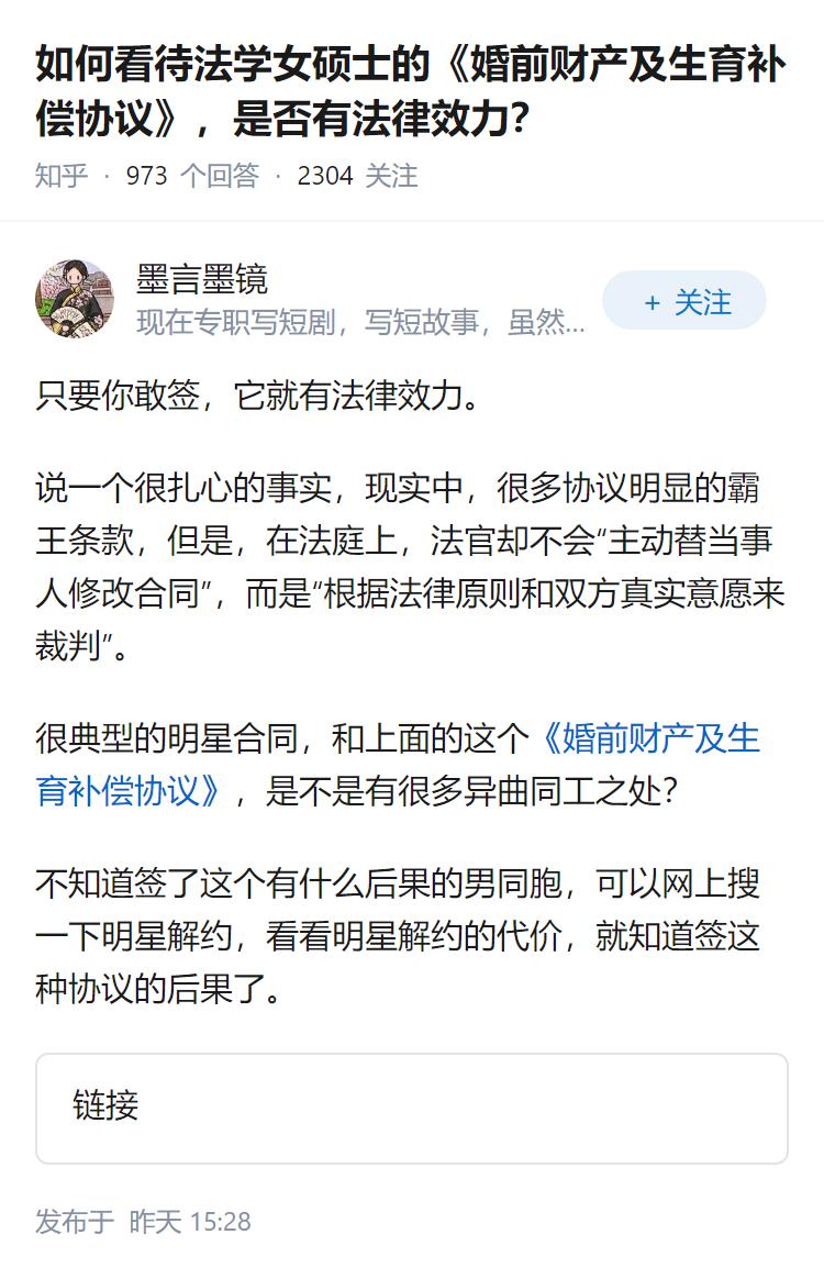 如何看待法学女硕士的《婚前财产及生育补偿协议》,是否有法律效力?