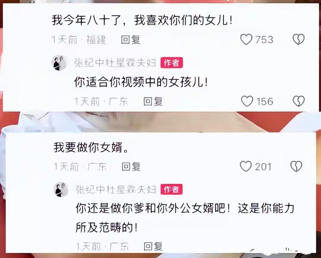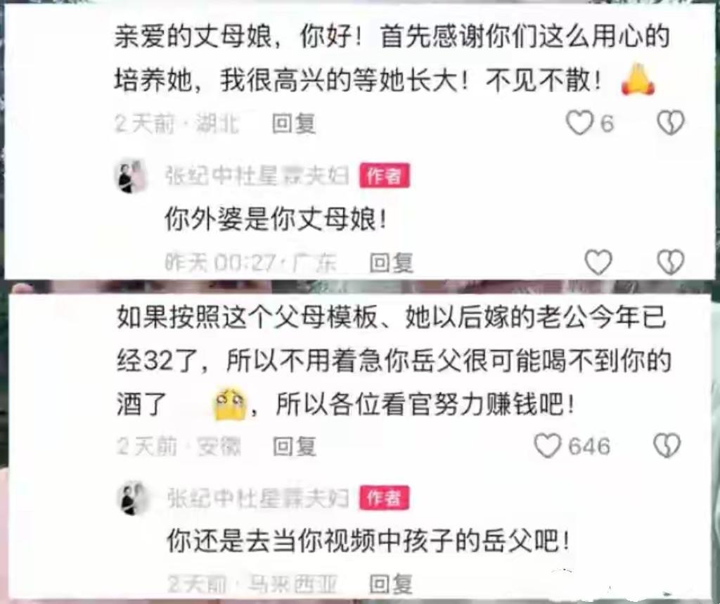 近日,74岁张纪中发视频庆祝女儿1岁生日,遭网友玩梗“求娶”,张纪中公开怒怼:你外婆是你丈母娘! 张纪中的现任妻子杜星霖出生于1982年,是其第三任妻子,婚前曾是他的助理。2024年10月,杜星霖为张纪中生下两人第四个孩子。 网友评论: 他娶年轻女孩觉得无可厚非,但是别的老头娶他女儿不行! 说实话,你攻击张夫妻俩大部分网友感到解气,但不该攻击一岁的女娃娃,这是做人的底线,换谁谁也会还击的!如果是面对面,他可能会和你拼命的! 应该是张老汉老婆回复的,老汉直播都睡觉去,老汉已经没有精力玩手机了! 他俩就悄悄的过日子就完了,非要天天在网上自曝。不知道炫耀啥?被怼是纯自找的。 幸亏他现在不当导演了,不然就他说的这句话,还有谁看他导演的电影?? 各位提亲大军,不用给老张面子,20 年以后,他在哪不知道,但一定要给丈母娘面子,她才是决策者! 老张同志身体棒棒哒………都70多了还是如此为中国的人口红利做不屑的努力! 今天是我37岁生日,我未来的老婆刚满周岁的可能性非常大……财富是我最大的底气!