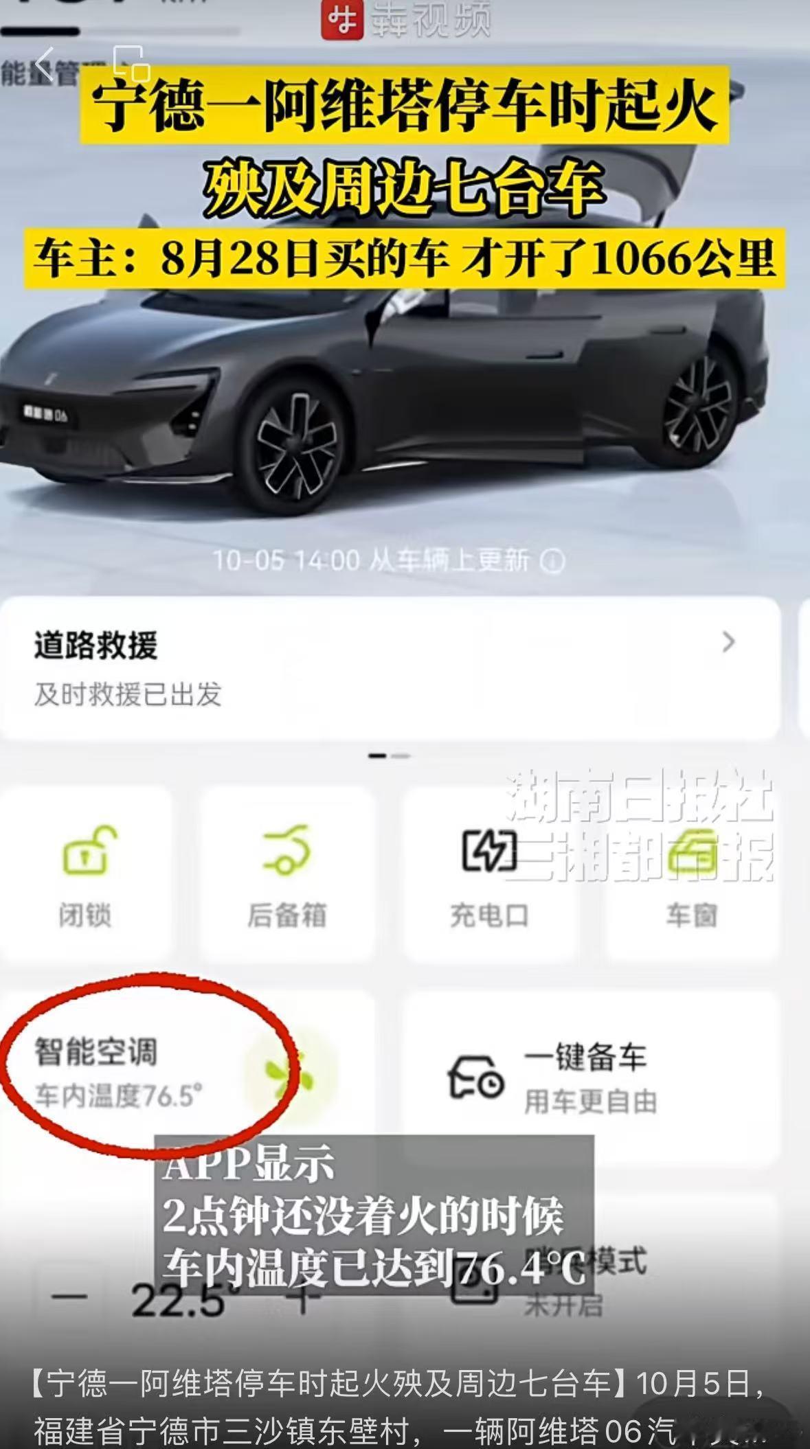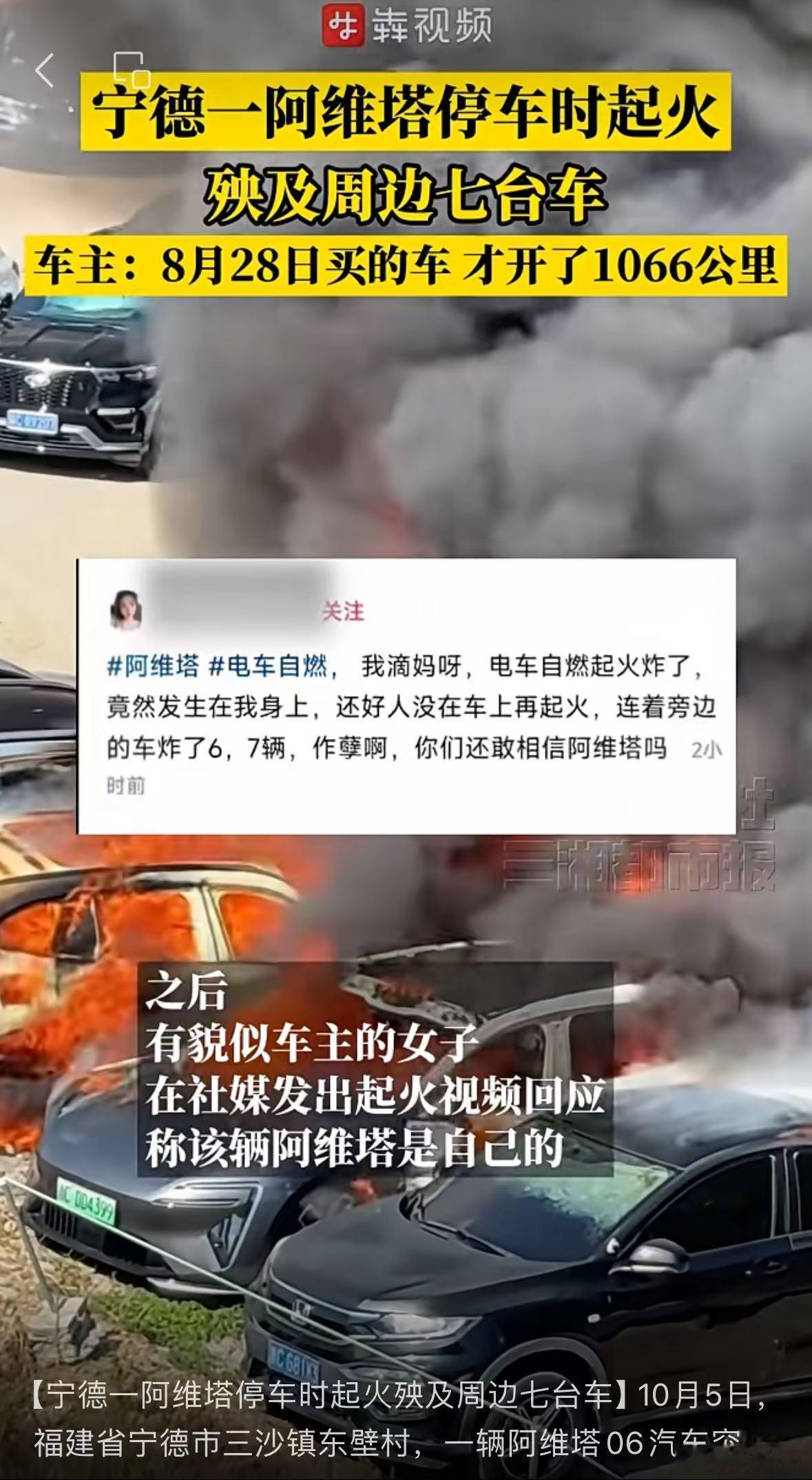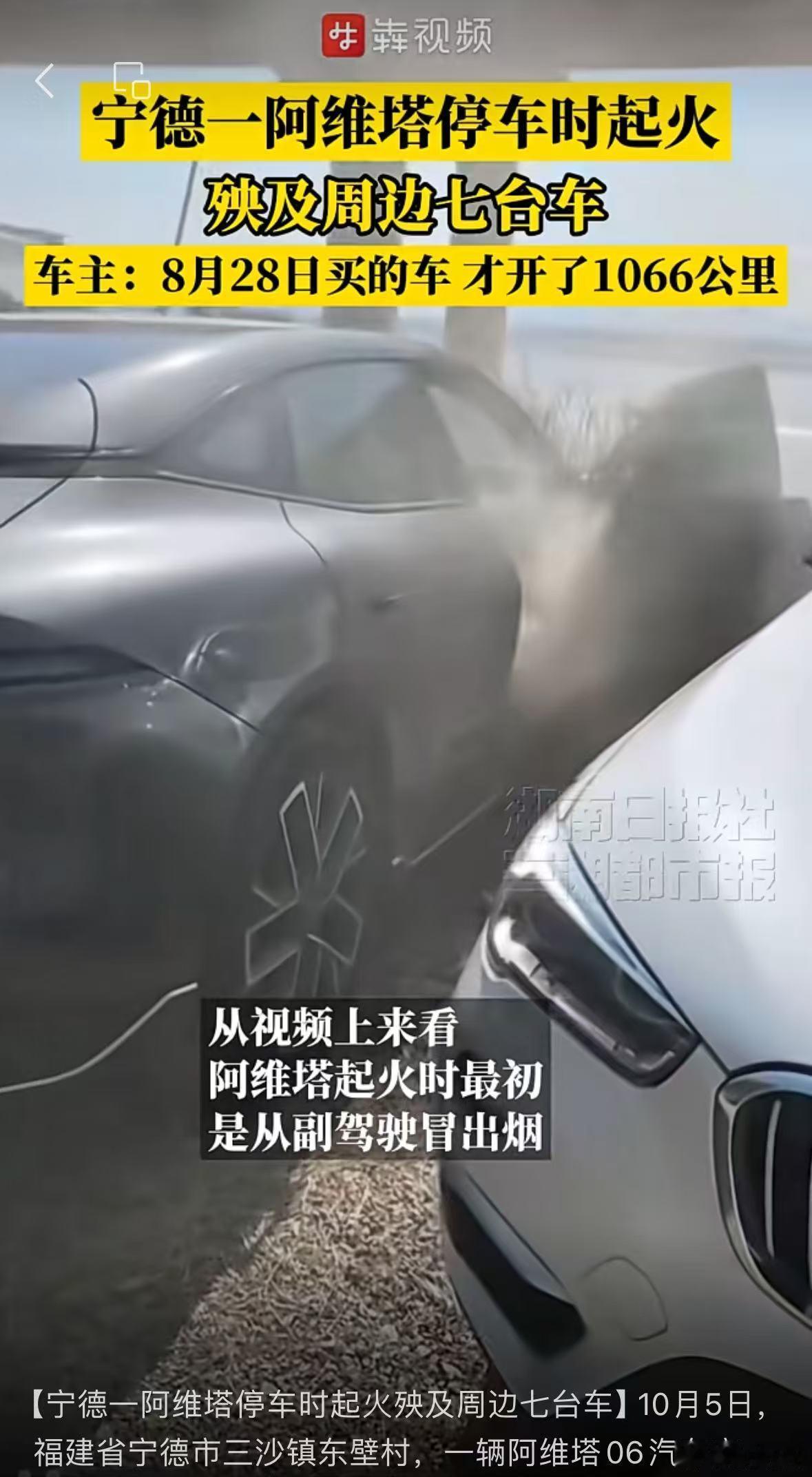 宁德阿维塔06起火致8车焚毁宁德自燃小车才开了1066公里