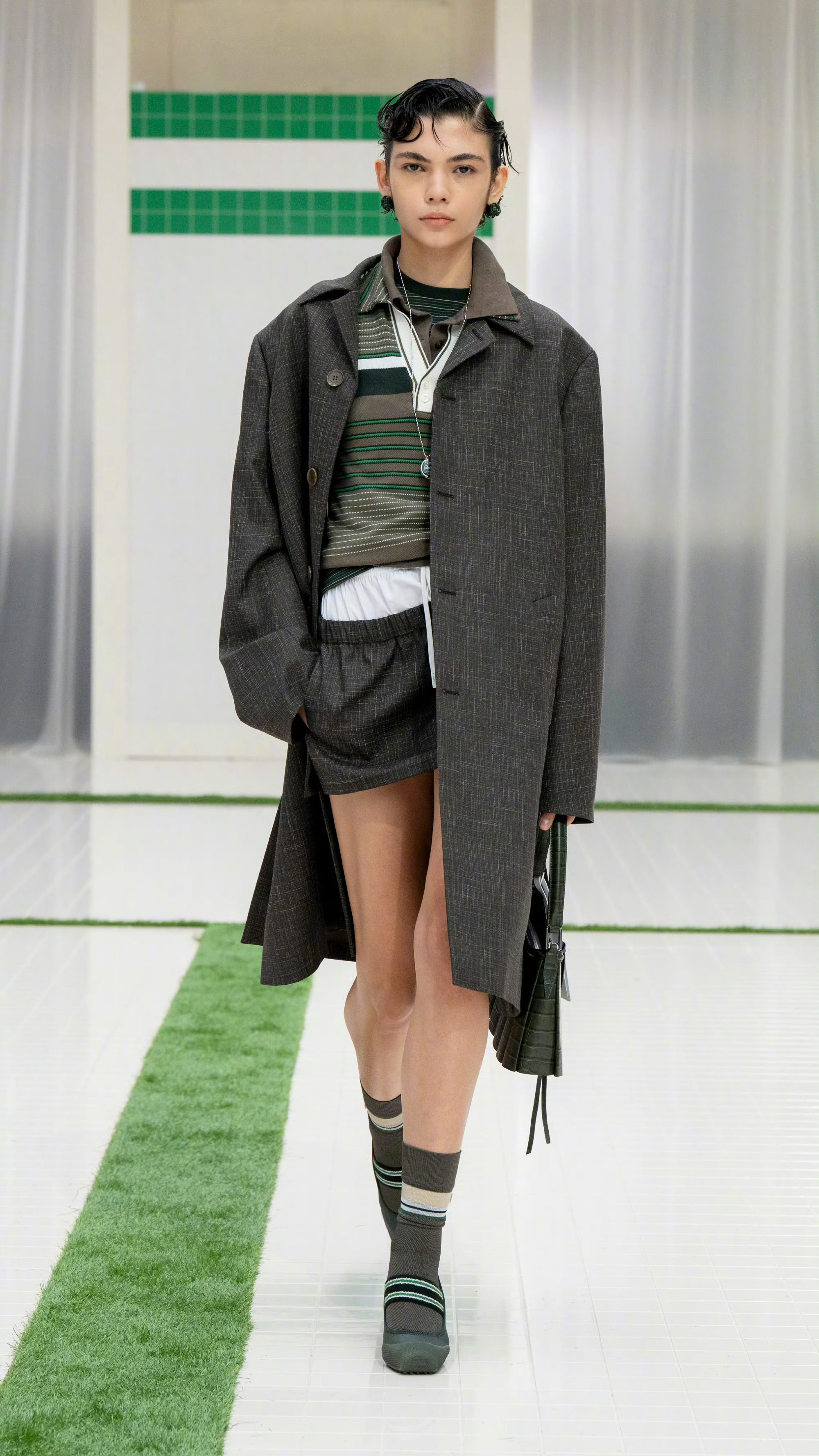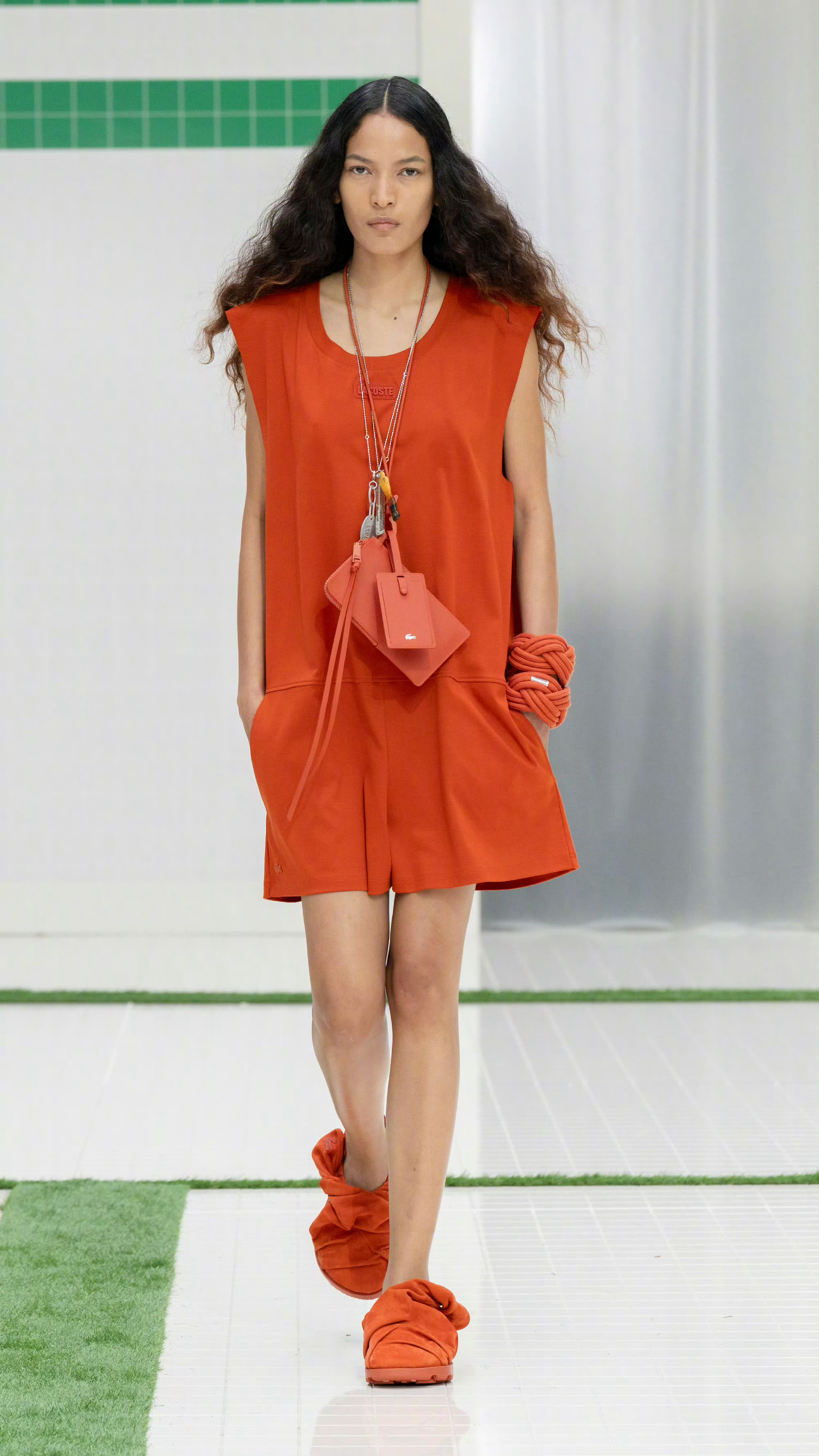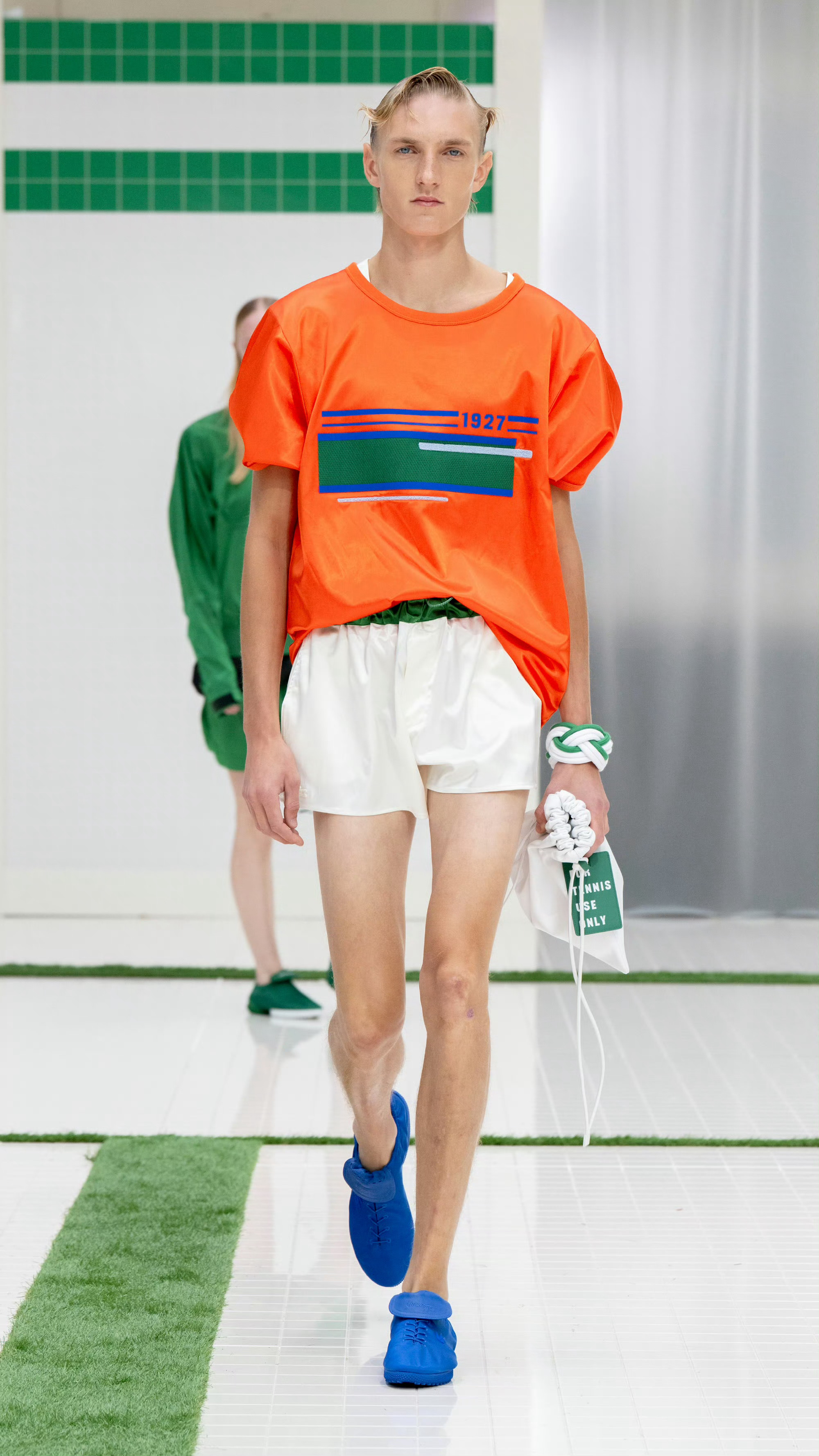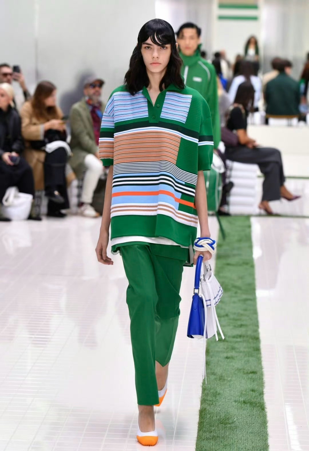 本季秀场舞台重塑为“更衣室”,通过瓷砖铺陈的墙面重现了 René Lacoste 等所有运动员所熟悉的“后台”氛围。 ​​​