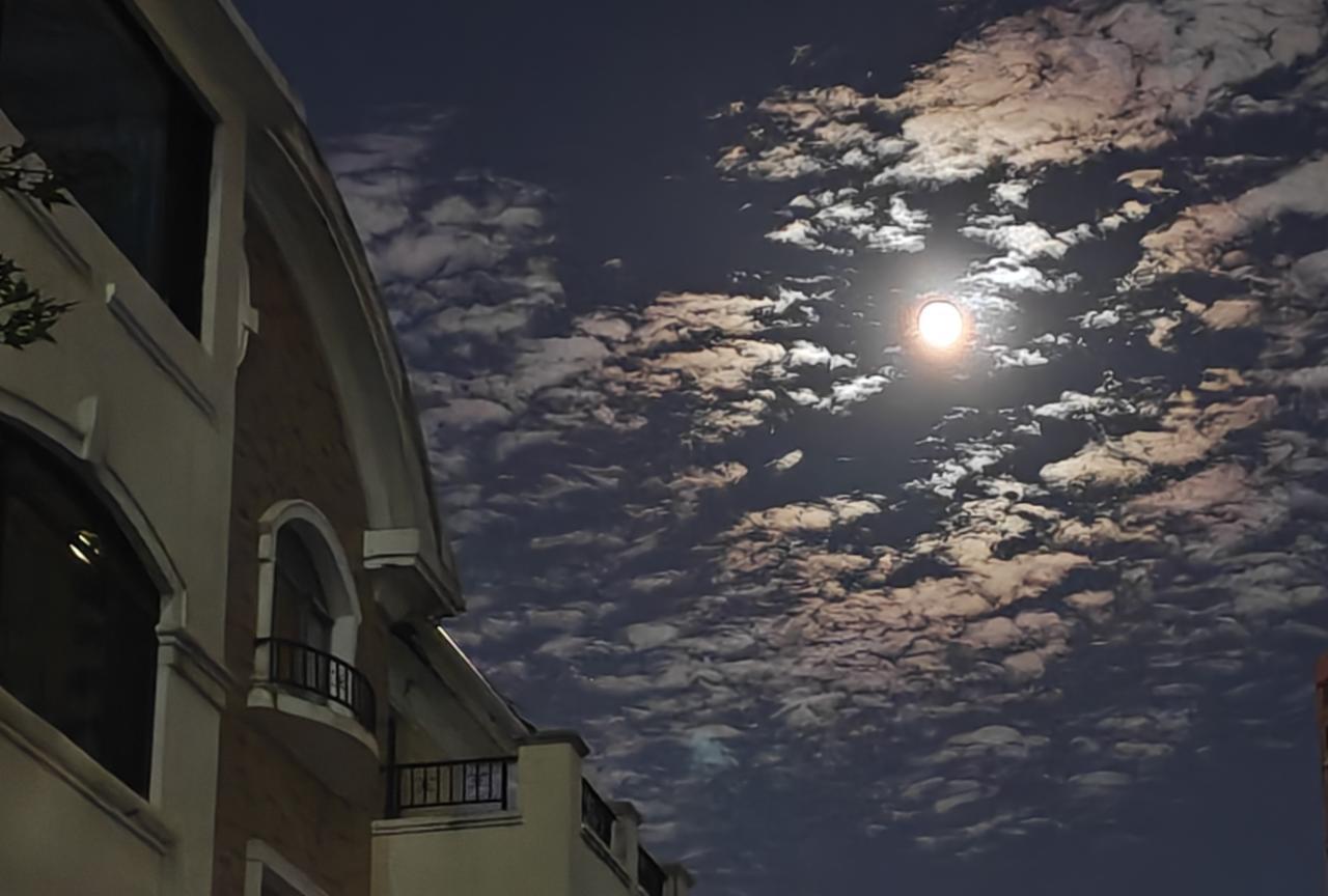 八月十五月儿圆, 果然名不虚传! 家人团聚, 推杯换盏, 吃饱喝足后, 又打了两圈小麻将。 完活后, 开启了吃月饼,赏月。 一轮明月天空挂, 中秋月圆, 人间美满, 树影婆娑, 美成了一幅画! 2025年, 秦皇岛的一轮明月, 怎么样? 可好? [微风][微风][微风][微风][微风]
