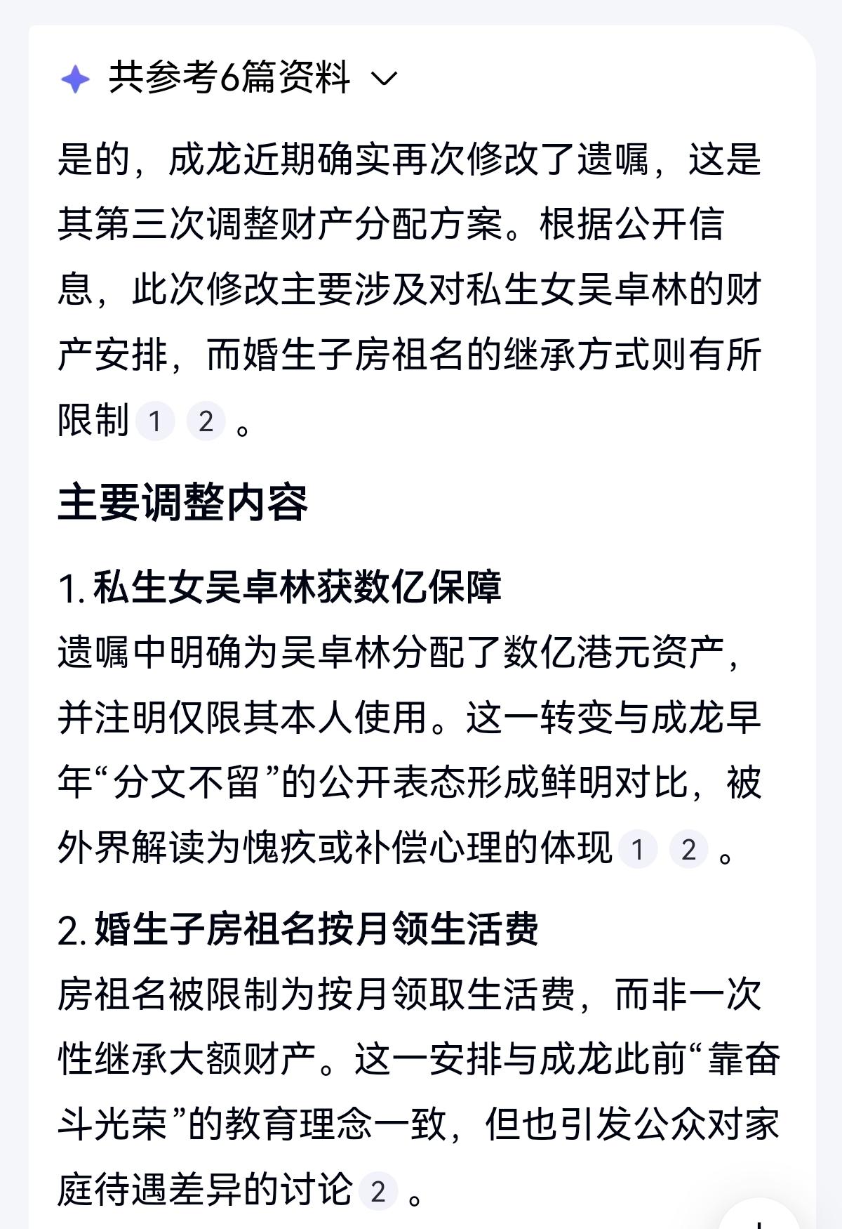 吴卓林回港住小宾馆,成龙改遗嘱留后路:这对父女,体面得让人心疼 由于护照到期,吴卓林悄悄回了香港。没找成龙,没闹脾气,自己挤小宾馆,朋友凑机票钱,还说:不靠成龙闺女吃饭。倔得让人心酸。 那边成龙没吭声,却又一次修改遗。没公开认女,也没躲责任,用最实在的方式留了条退路。 父女两人像隔条河,她不喊穷不卖惨,他不炒作不回避。没拥抱没争吵,就这么不远不近。 娱乐圈撕破脸的多,这无声的体面,倒成了最暖的牵挂。为成龙点赞! 吴卓林 成龙