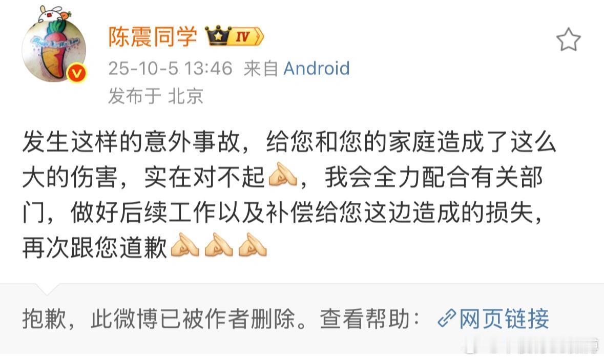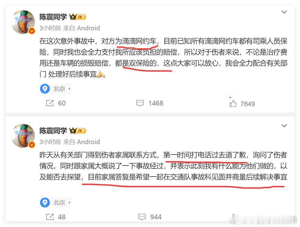 陈震透露,“对方为滴滴网约车,目前已知所有滴滴网约车都有司乘人员保险,同时我也会全力支付我所应该负担的赔偿,所以对于伤者来说,不论是治疗费用还是车辆的损毁赔偿,都是双保险的,这点大家可以放心,我会全力配合有关部门 处理好后续事宜。”