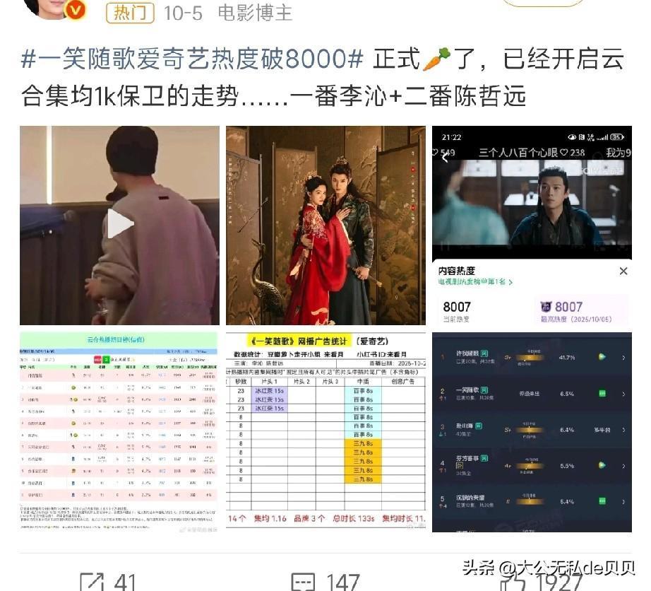 一笑随歌陈哲远是二番,扑了也不会算他身上。 不过,对李沁来说,以后再接好点的一番古偶就有点吃力了。 因为她这部剧的播放数据实在一般。 首日云合播放量不足千万,连95花00/花都比她高。剧播了10集了,云合还不到10。 看得出来,李沁也很着急,把娱乐圈几乎所有的的人脉都给请来转发打call了, 效果是有一些,但不多。热度才刚刚破8000,最后能不能破9000都难说。 我早说过,李沁这样的长相就不适合演古偶,拍了那么多,一个出圈的cp都没有。 至今讨论最多的cp依然是白鹿原的黑娃。 同龄的女星都开始转型演正剧了,她却还在古偶打转,足以说明演戏事业是走下坡路的。 李沁