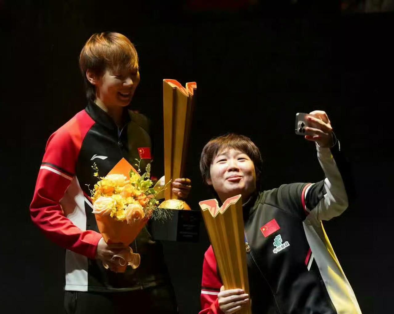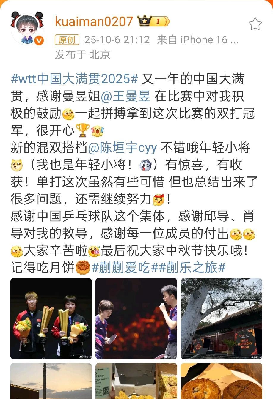 蒯曼发文先感谢曼昱姐,一起拼搏女双夺冠。 又调侃搭档陈垣宇,依然还是小将,当然也承认自己是小将,混双有惊喜也有收获。 最后说女单有遗憾,但也会继续努力。 分享六张图片,二张是美食,这就是大丫头喜欢美食本色,只要赛后更新,除了总结和感谢,必定有美食,喜欢吃和喜欢笑是蒯曼特色,喜欢真实单纯的大丫头。 加油蒯曼,下一个赛场取得好成绩。 图片来自网络侵权可删。