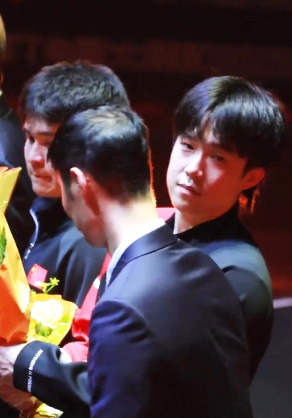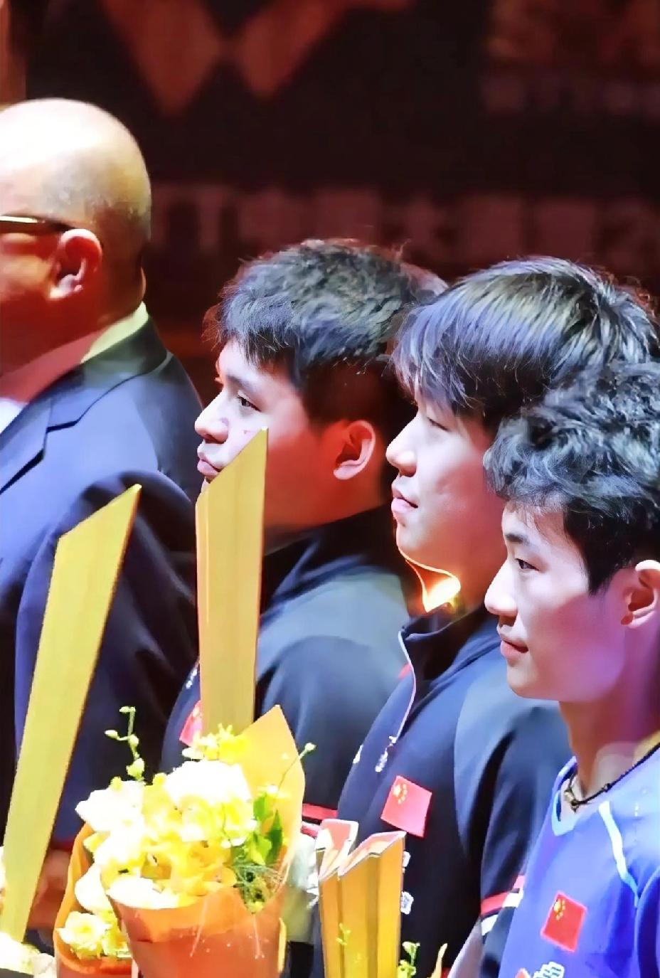 谁懂王楚钦这个温柔的眼神, 嘴角不自觉地上扬, 秒变温柔的大哥哥。 这一幕发生在北京大满贯, 男双颁奖仪式上。 冠军发奖完毕, 下一步就是冠亚军合影。 他害怕周启豪/陈俊菘不太熟悉流程, 和颁奖嘉宾合完影, 立马转头看向旁边等待的队友, 示意他们过来合影。 王楚钦看国乒弟弟的眼神超温柔, 就是坚毅的眼神, 带着大家一起努力往前冲。 国乒还是那个国乒, 这句话的含金量还在上升。 (图片源自于网络)