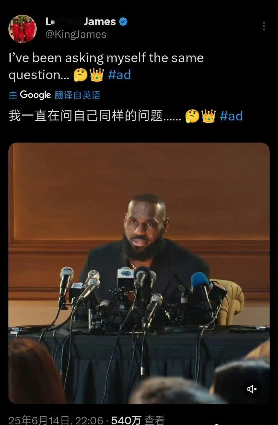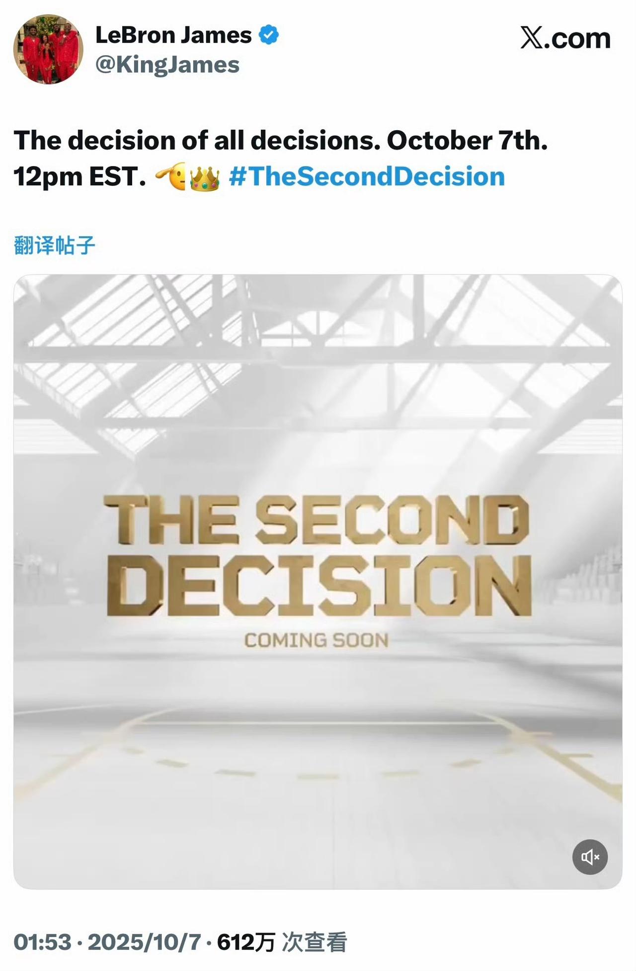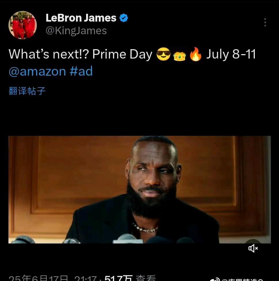 恰好明天又是亚马逊会员日,如果真的只是广告,那么这种博眼球方式方法,确实管用。 詹姆斯在6月份时,曾发布过“耐人寻味卖弄玄虚”内容,当时给自己配上皇冠,引发外界大量猜想。最终只是亚马逊的会员日广告,但确实博得了流量。 当时后面都加上了“ad(广告)”,但这次没加,直接就是“决定二”。
