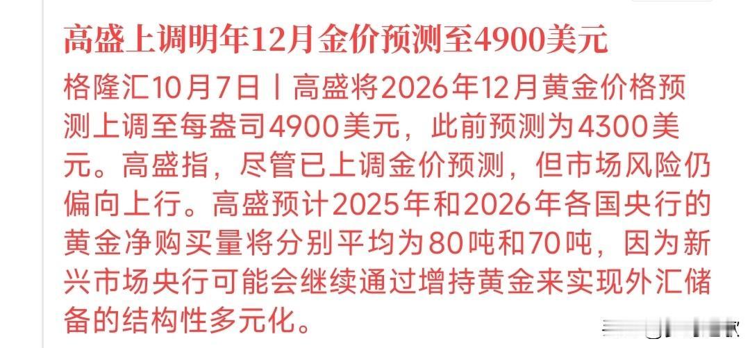 金价暴涨,金饰品再次突破,原因出在美国,大机构再次提高金价价格 昨晚黄金再次暴涨,国内金饰品突破1157元每克,一夜涨了16元,在十一假期之前还是1106元每克,十一放假涨了50元每克。 在黄金大涨后,高盛预测到2026年12月黄金会涨到4900美元每盎司,要知道现在的黄金价格是3964美元,也就是还有1000美元的上涨空间。 黄金上涨的主要原因就是美国政府停摆带来的不确定性,迫使全球资产购买黄金避险,昨晚美提出的法案再次被否决,这已经是第二次了,不知道什么时候能够复工将会使黄金持续的上涨。