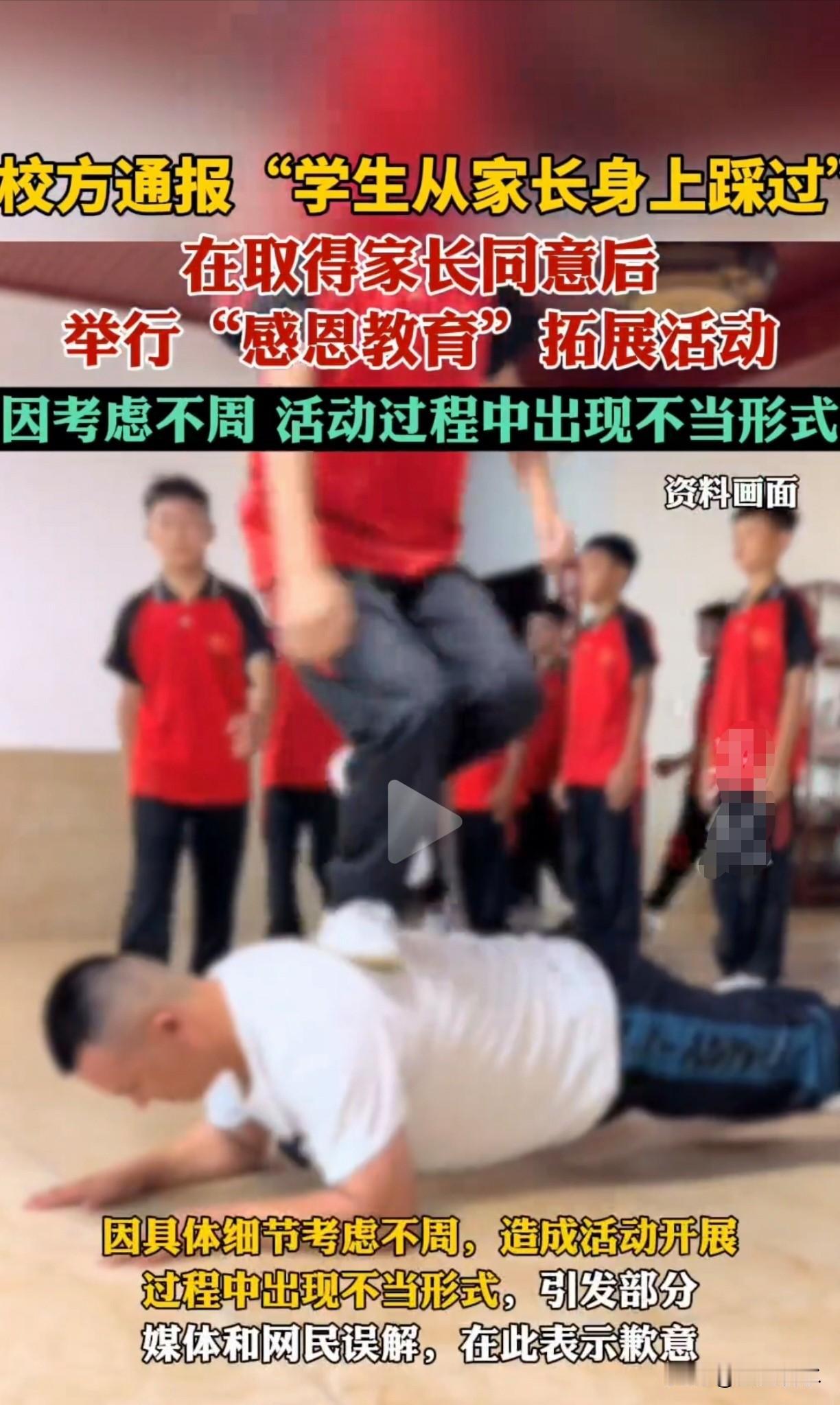 中秋节前一周,在中牟县某中学教室里 家长们跪成一排,学生疑蒙眼从家长们的背上踩过,已接到学生投诉,正在调查处理。 现在的教育究竟是怎么了?有过度体罚学生的,有对学生做不良行为的,现在又整这出,学生从家长身上踩过,这是什么样的老师才能想出这样让学生触动的方法,家长供孩子读书像供菩萨一样供着,本就很卑微了,还这样踩踏家长,家长的尊严何在?让学生给家长洗脚捶背我还能理解。 也许这样做,不仅家长感到难堪,学生同样如此,两者都会感到很卑微,旁观者更是没眼看,踩踏父母的身体叫“感恩教育”?这不是在践踏亲情吗?要让学生感到父母的不易,让学生参加农活就好了,自己去洗衣做饭,这样也许更实用,让学生学会省吃俭用,去体验一下父母的生活,比这什么精神式冲击好多了。 总之,对青少年做感恩教育,有必要。但是不提倡越界,以及阵风式感恩教育,犹如早些年疯狂英语进校园,感恩教育最后变为卖书,卖课程,失去了初心,令人作呕。学生是我们祖国未来的花朵,严厉打击那些误导青少年和不良作风的老师,也是在为我们国家国力做出重要保障,俗话说的好,少年强,则国强!对此大家怎么看呢?