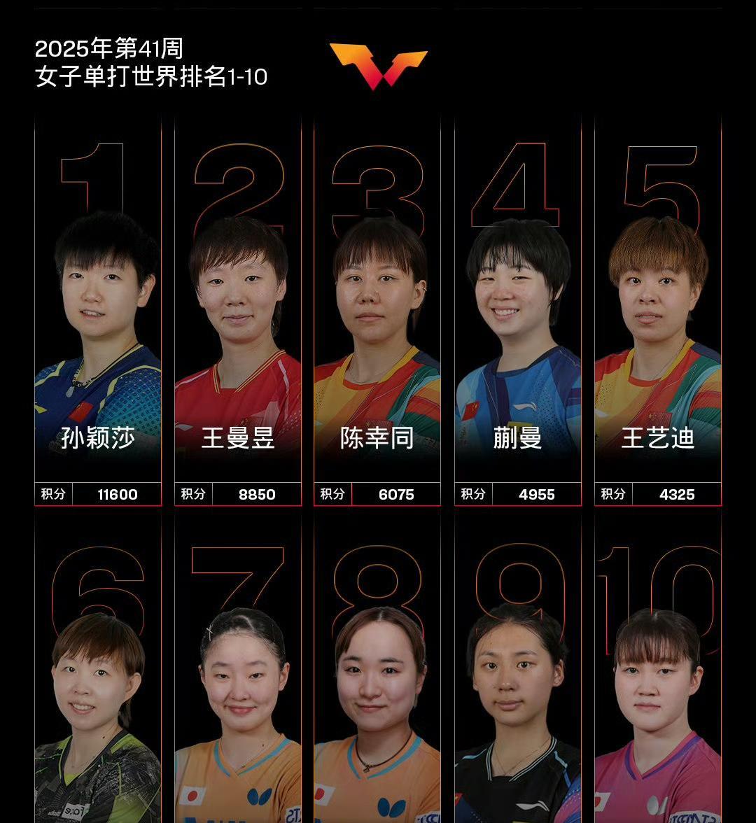 国际乒联最新世界排名! 国际乒联2025年第41周世界排名如图所示。 本周将加上2025WTT中国大满贯和2025WTT中国青少年大满贯的积分,去年WTT中国大满贯的积分随之失效。 女单方面,中国队球员莎莎、曼昱、同同、蒯曼、大迪依次包揽前五,陈熠位列第九。 孙颖莎的目前积分是11600,莎莎的这个分数其实在一年前就是五位数了,不论在男线还是女线,莎莎都是第一个超过万分的选手[赞]! 而王楚钦的积分也破万,王楚钦是改制后首位乒坛男子万分王[赞]!
