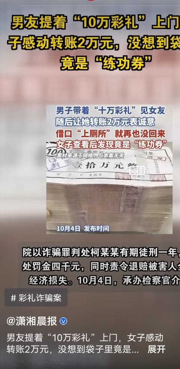 惊喜变惊吓!黄石阳新,一女子和一男子网络奔现,在第一次见面时,他就拿来了一个沉甸甸的袋子,据他所说,这里面是他给女子的“求婚诚意”,里面足有十万元现金,这让这名女子非常感动,于是对男子放松了警惕,并回馈了男子两万元的打款,哪知男子收到钱后,便找了一个机会溜之大吉了,而这名女士去查看那包装钱的袋子,却发现里面全是“练功券”。 据极目新闻报道:2024年10月22日的晚上,明女士在一交友平台上突然收到了一则交友申请,打开一看,是一个长相有点帅气的男子。 这个男子叫柯某,是一个也想早点解决人生大事的人,当得知明某是在找可以以结婚为目的的恋爱对象时,柯某真诚的告诉明某,说自己的目的和她是一样的。 之后两人又聊了一段时间,明某发现柯某说话得体,虽然也只是职场上的普通工薪阶层,但明某依然对他非常满意。 随着两人感情的深化,柯某终于对明某提出了线下见面的要求,还说自己会给明某一个惊喜,对此明某也非常开心,于是把自己的住处告诉了柯某。 时间很快到了约定的那天,在出了门以后,明某就在楼下看到了柯某,他打扮的比较时尚,并且手里还提着一个沉甸甸的袋子。 当明某问柯某这是什么的时候,柯某打开了一点,透过袋口发现里面是一沓沓崭新的人民币。 还没有等明某反应过来,柯某就说自己手里的这些钱足有十万,是他想要和明某走入婚姻殿堂的“诚意”,这样的好心让明某非常感动,于是她对柯某放松了警惕。 之后,柯某便和明某表示,说自己已经拿出诚意了,让晚上带他认识一下明某的父亲,还承诺如果见了她的父母,他还会拿出十万块现金作为彩礼的。 这让明某大喜,以为自己遇到真爱了,于是在接下来的时间里,明某和柯某关系更亲密了,在这时柯某却要求明某展露一下她的诚意。 柯某直接让明某用支付软件给自己打款两万,表示下午会返还给她的,却没有想到明某在打了钱以后,却很快遭遇了对方的失联,随即明某便选择了报警。 那么从法律角度,该如何看待明某遭遇的这件事呢? 根据《刑法》第266条规定:首先诈骗罪的定义是指以非法占有为目的,使用欺骗方法,骗取数额较大的公私财物的行为。 根据司法解释,若是以下几个要件符合要求的话,将会被认定诈骗罪事实成立: 行为人要实施了欺骗行为。2、被害人陷入错误认识处分财产。3、行为人具有非法占有的目的。4、被害人因此遭受财产损失。 在本案中,柯某利用那些练功券让明某有了一个错误的认知,以为柯某是真心且有实力和自己成为夫妻的,因此他相信了柯某的谎言,错误的处置了自己的财产,并且事后柯某无故失联,符合以上的法律要求,因此柯某构成诈骗罪行为。 那么柯某应该如何量刑呢? 根据《刑法》第二百六十六条诈骗公私财物,数额较大的,处三年以下有期徒刑、拘役或者管制,并处或者单处罚金;数额巨大或者有其他严重情节的,处三年以上十年以下有期徒刑,并处罚金;数额特别巨大或者有其他特别严重情节的,处十年以上有期徒刑或者无期徒刑,并处罚金或者没收财产。本法另有规定的,依照规定。 根据司法解释,数额较大的为3000元至10000元,数额巨大的为3万至10万元,数额特别巨大的为50万元以上。 在本案中,柯某的行为已经构成诈骗罪了,他行骗的资金数额为2万元,按照法律规定,属于数额巨大的,因此柯某有很大概率会按照本条法律数额巨大一类进行量刑,会判三至十年有期徒刑,并处以罚款。 那么使用练功券的行为涉嫌使用假币的违法行为吗? 根据《刑法》第172条:使用假币罪指明知是伪造的货币而持有、使用,数额较大的行为。 根据司法解释:“使用”是指将伪造的货币冒充真币而予以流通的行为。使用的具体方法:用来购买商品、偿还债务、借予他人或者充当赌资等。 在本案中,柯某的十万练功券虽然看起来和真货币相似,但是它们并不是假币,顶多算是可以用来娱乐的支付道具,因此柯某并没有涉嫌使用假币的违法行为,同时这些练功券也并没有流通市场的行为,这使得柯某不会被追究这类案件的刑事责任。 最终柯某因为诈骗罪被量刑了,等待他的必将是法律的制裁,对此你怎么看?