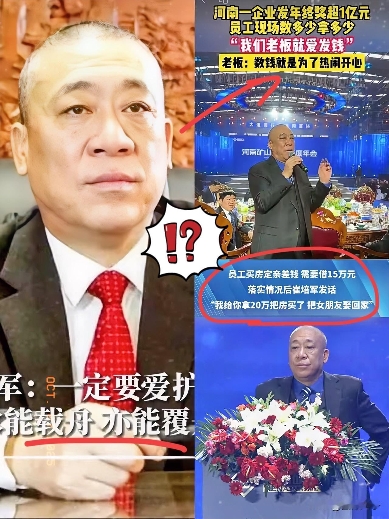 研究了一下崔培军这个人, 查了之后,终于恍然大悟了, 河南矿山的董事长崔培军,真是让人琢磨不透。 年利润2个多亿的企业,在同行里顶多算“微利玩家”,他却反手把一半利润分给7000多号员工,自己日常就穿20块布鞋、吃青菜馒头,低调得像小区里遛弯的退休大爷。 别以为他抠,对员工可大方的很。中秋办孝文化节,请19000人来,还给员工父母发600块红包;妇女节女员工直接领800块,秋收补1000块收割机钱,员工买房差15万,他直接塞20万让娶媳妇。22年还悄悄资助了4300多个贫困生,就因为他说“自己苦过,就不想员工再苦”。 现在满大街说“企业要讲情怀”,可太多人把情怀当口号喊,崔培军却把利润变成了员工手里的实在钱、父母脸上的笑。 你身边有没有这样“不按套路”的好老板?来聊聊你的经历~