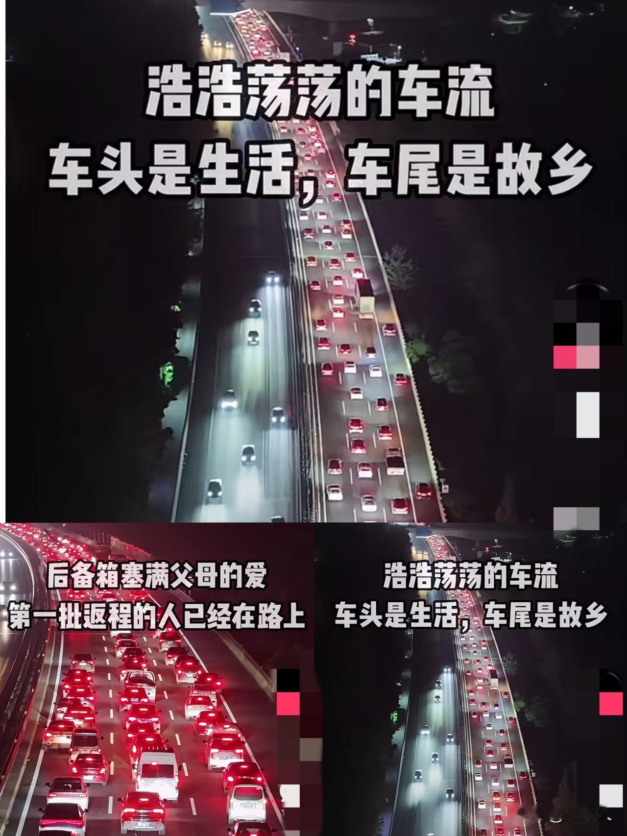 国庆返程:后备箱的爱与车龙里的乡愁,下次相见已是年》 夜幕下的高速,红得像串起来的灯笼,却照不亮归乡人心里那点舍不得。 你看这浩浩荡荡的车流,车头是生活,车尾是故乡。后备箱里塞的不是土特产,是爸妈凌晨爬起来现摘的青菜,是坛子里泡了大半年的酸菜,是偷偷塞进你包里的红包——他们总怕你在外面吃得不好、过得不暖,却从不说自己为了装满这后备箱,前一天晚上就没睡踏实。 第一批返程的人已经在路上了,评论区有人调侃“没事儿,不用伤感,再过4个月又回来了”,可笑着笑着,眼泪就差点掉下来。 我们总说“常回家看看”,可真到了分别时,才发现“下次见面,就是过年了”。这一路的拥堵,堵的是车,也是对家的眷恋;这后备箱的“超载”,载的是物,更是父母沉甸甸的爱。 或许生活就是这样,一边是离不开的远方,一边是回不去的故乡。但好在,无论走多远,总有个地方,有人盼着你回来,有人把你爱吃的菜,一直留到你下次进门的那一刻。 不知道已经在路上你们还是准备回去的人你们后备箱里装了?