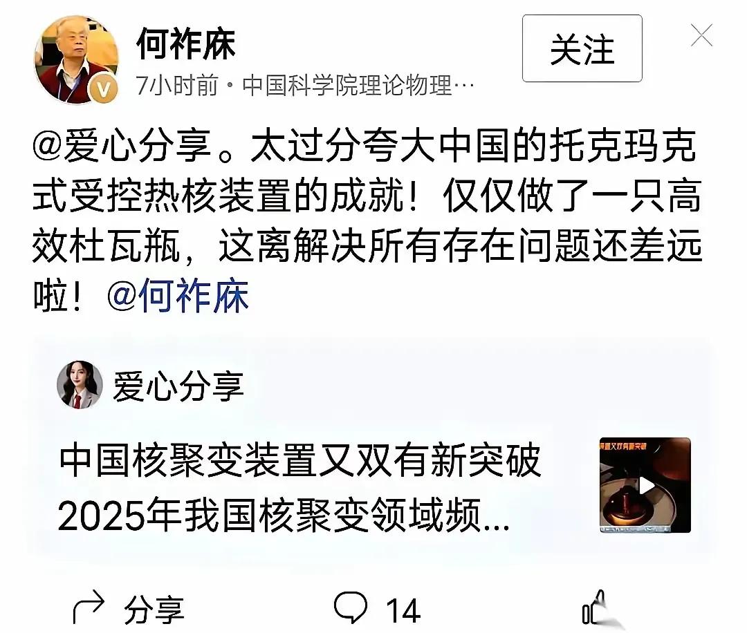 这个老何,挺有意思。但凡中国取得一点成就,无论是哪个领域的成就,他都会跳高,跳将出来,给予否定。不管他知不知道,不管他熟悉不熟悉,不管是不是自己的领域,不管是不是真的有成就或是没有成就,他都下意识地条件反射,好像形成了肌肉记忆般,进行反对。这完全是一种下意识的病,一种毛病,这种病本质上说是什么病?准确的说,这是一种恨国病,凡是美西方的,好,很好,非常好,十分优秀。凡是中国的,差,很差,非常差,什么都差。 这么多年来,他大门不出,二门不迈,仅仅在朋友圈获得一点知识。曾经从上海交通大学混到了北京大学,然后又混进了院士队伍,一直都是不学无术,混混一个,既不学习,更不进行知识的更新以及知识的储备,对新的知识一无所知,偏偏自以为是,夜郎自大。当然了,也许他是故意的,也许从好的方面理解他是希望这个国家更好,然后什么都要提出批评意见,什么要有独立意识,再说了,提出不同的意见,可以显示自己是人间清醒,高人一等。但是,究竟目的是什么?我们不知道,只有他自己知道。究竟是被美西方欢迎的打手,还是自我标榜者不知道,也许二者兼而有之,打手兼美西方的吹鼓手,再兼“自我标榜者”,如此而已。