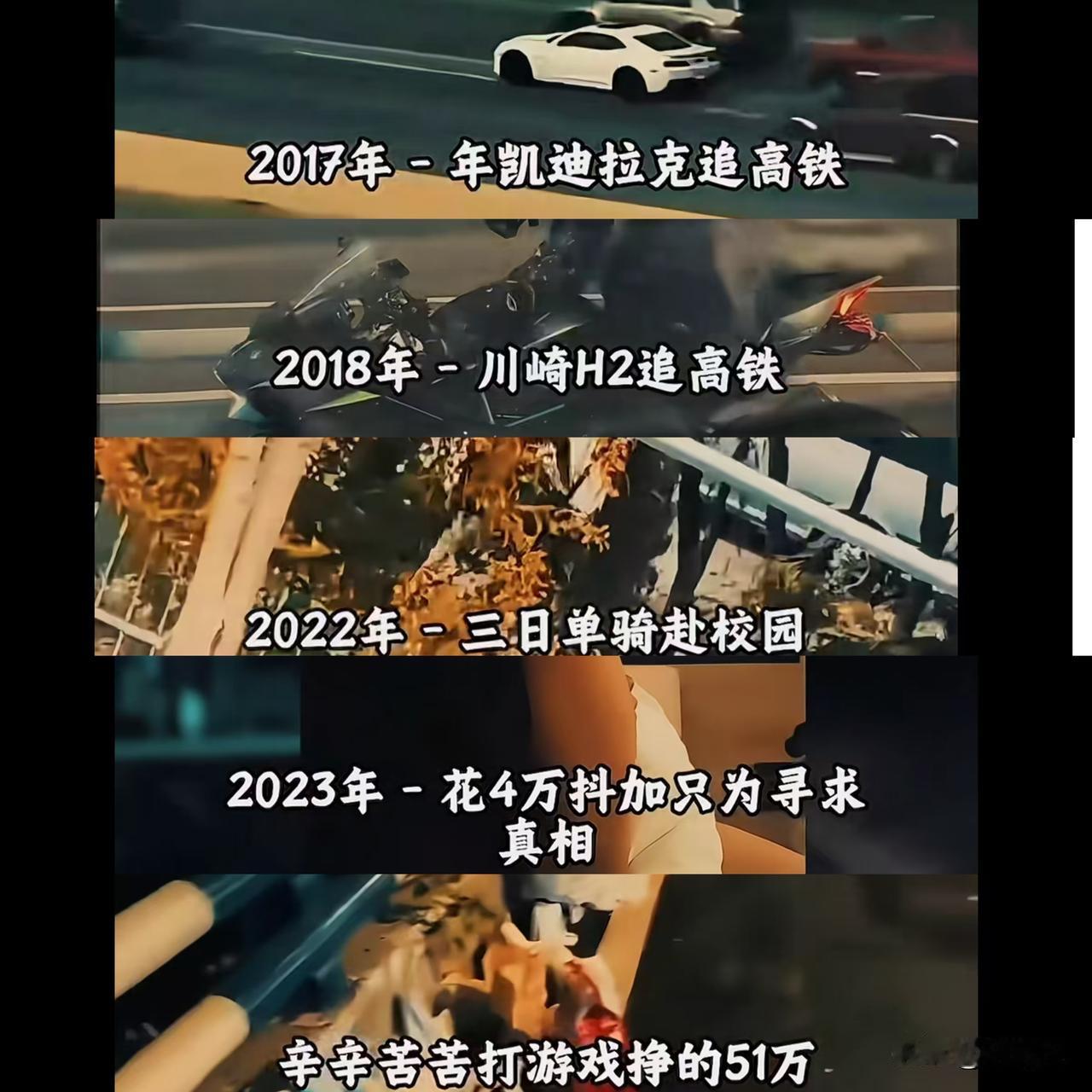 你告诉我,什么是爱情? 2016年,猪头追着燕子的出租车,跑过整个城市的喧嚣。 2017年,凯迪拉克冲上高铁轨道,最后车沉鱼缸,徒留一句“星辰大海”的虚妄。 2018年,川崎H2的引擎嘶吼着追逐高铁,却终究追不上那个决意要离开的你。 2022年,男生单骑奔赴校园,用外卖箱的温度供养女友的书本,换来的却是她与他人的暧昧纠缠,和他三天三夜堵在校门口的崩溃。 2023年,有人花四万刀跨国寻“真相”,最后只发现,所谓的背叛,不过是一场心甘情愿的退场。 2024年,游戏里的“通天带鱼”将51万血汗钱尽数捧给女友,却在领证前夕遭遇断崖式分手,他的IP地址,永远停留在了重庆的江堤。 你告诉我,这一次次飞蛾扑火,到底什么,才是爱情?