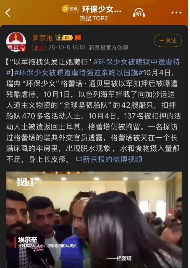 以色列的胆子确实太大了,居然敢与世界为敌! 10月1号,咱们正在过国庆节。可是,在中东,在加沙,却发生了这么一件事。国际友好人士组织40多艘船只,满载人道主义救援物资,浩浩荡荡开往加沙,却突然遭到以色列海军的围追堵截,470多名国际活动人士被抓捕,其中就包括瑞典著名的环保少女通贝里。7天过去了,以色列不得不释放其中的一些人。但是,通贝里的健康状况堪忧。在监狱里面,她遭到了虐待,以色列军人拖住她的头发,让她在监狱里面像狗一样爬行。通贝里出现了脱水、无法进食等状况,以色列军人还强迫她亲吻以色列国情等。 问题来了,通贝里心理阴影面积多大?接下来,通贝里会不会成为反犹领袖?咱们拭目以待。